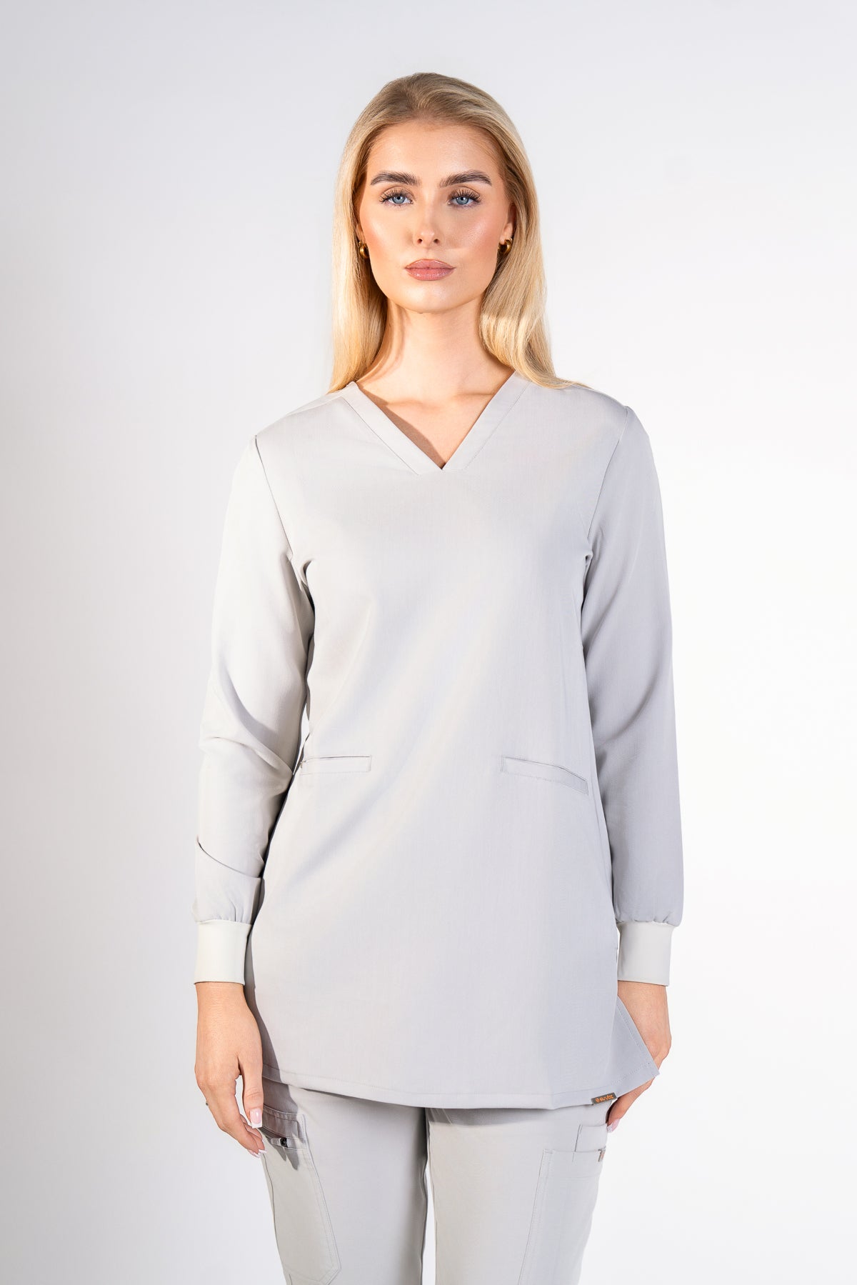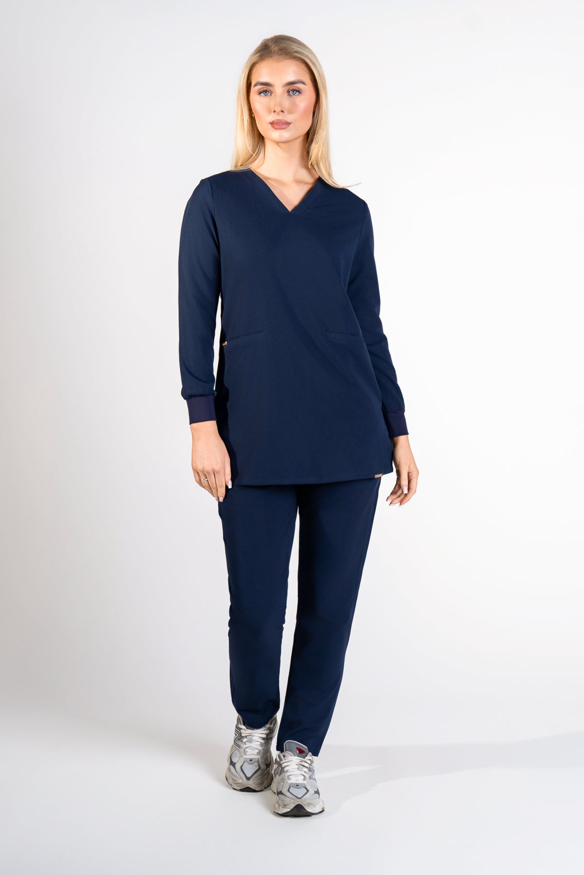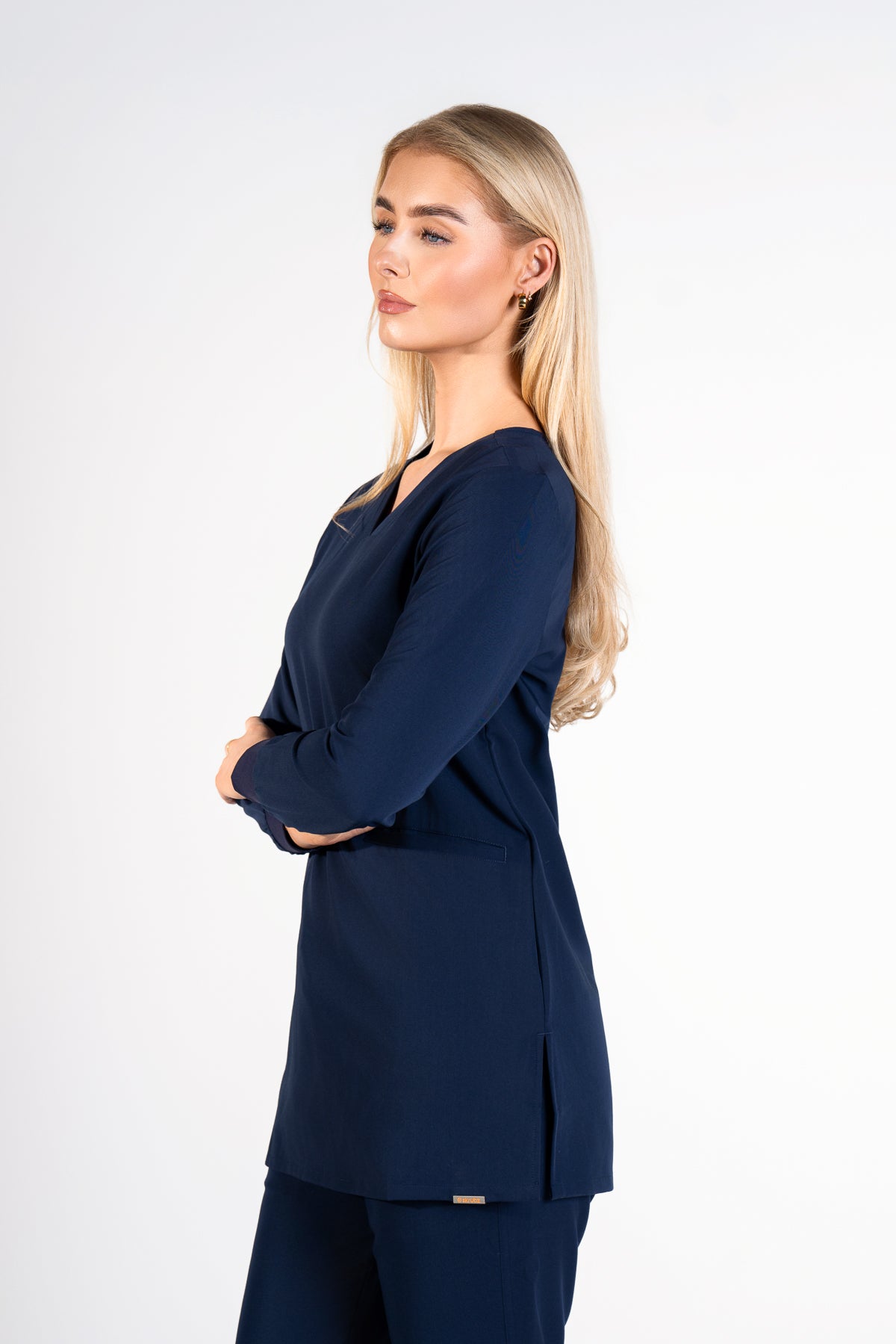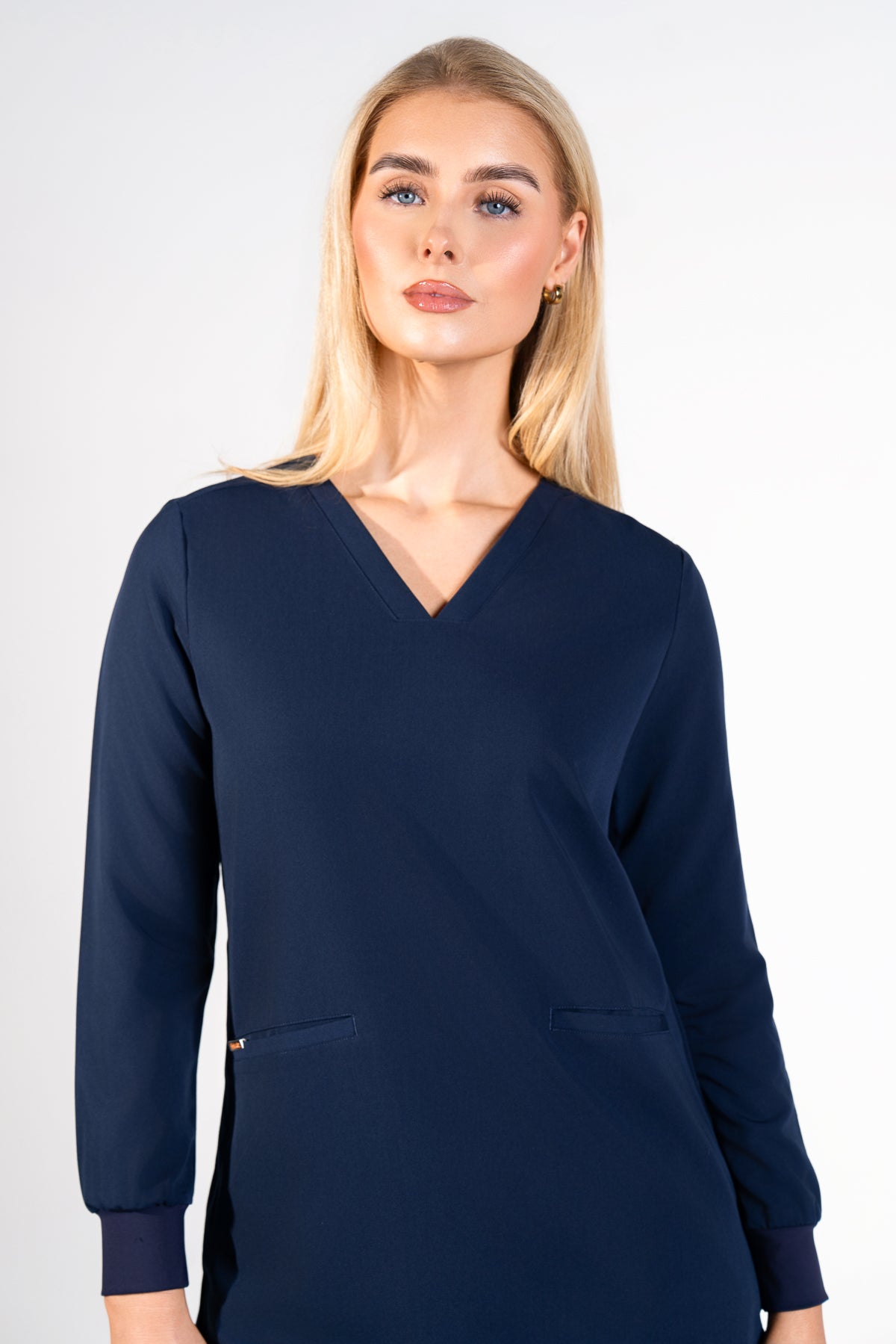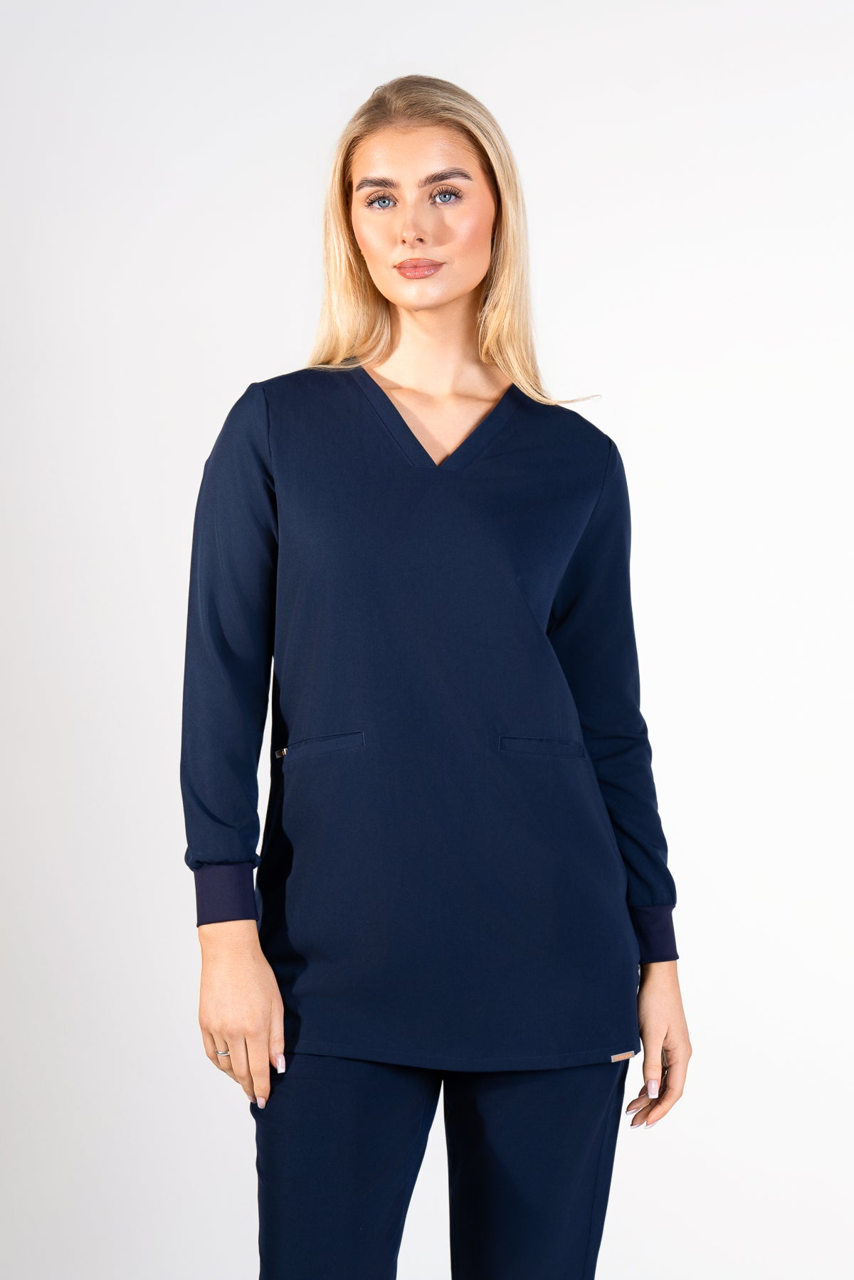 Absolutely adore this scrub top! The V-neck is so flattering, and the long sleeves provide great coverage during chilly shifts. Got it in navy and black, and both colours are vibrant and professional-looking.