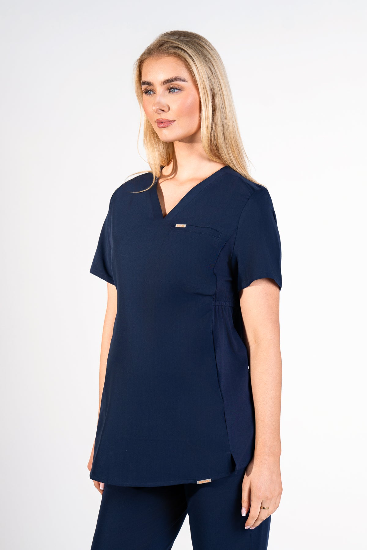 The slimline fit ensures a flattering silhouette without compromising on comfort, allowing expectant mothers to move freely and confidently throughout their shifts. Constructed with high-quality, 4-way stretch fabric, the Halo V-neck Maternity Scrub offers flexibility and breathability, adapting to the body's changes while maintaining freshness and comfort. Its anti-microbial properties ensure hygiene, while the anti-wrinkle feature ensures a polished appearance, making it the perfect choice for expectant mothers seeking both style and functionality.