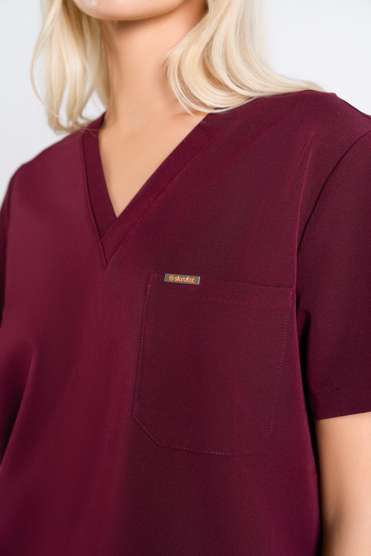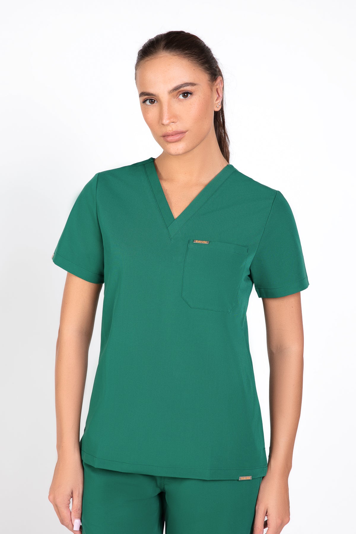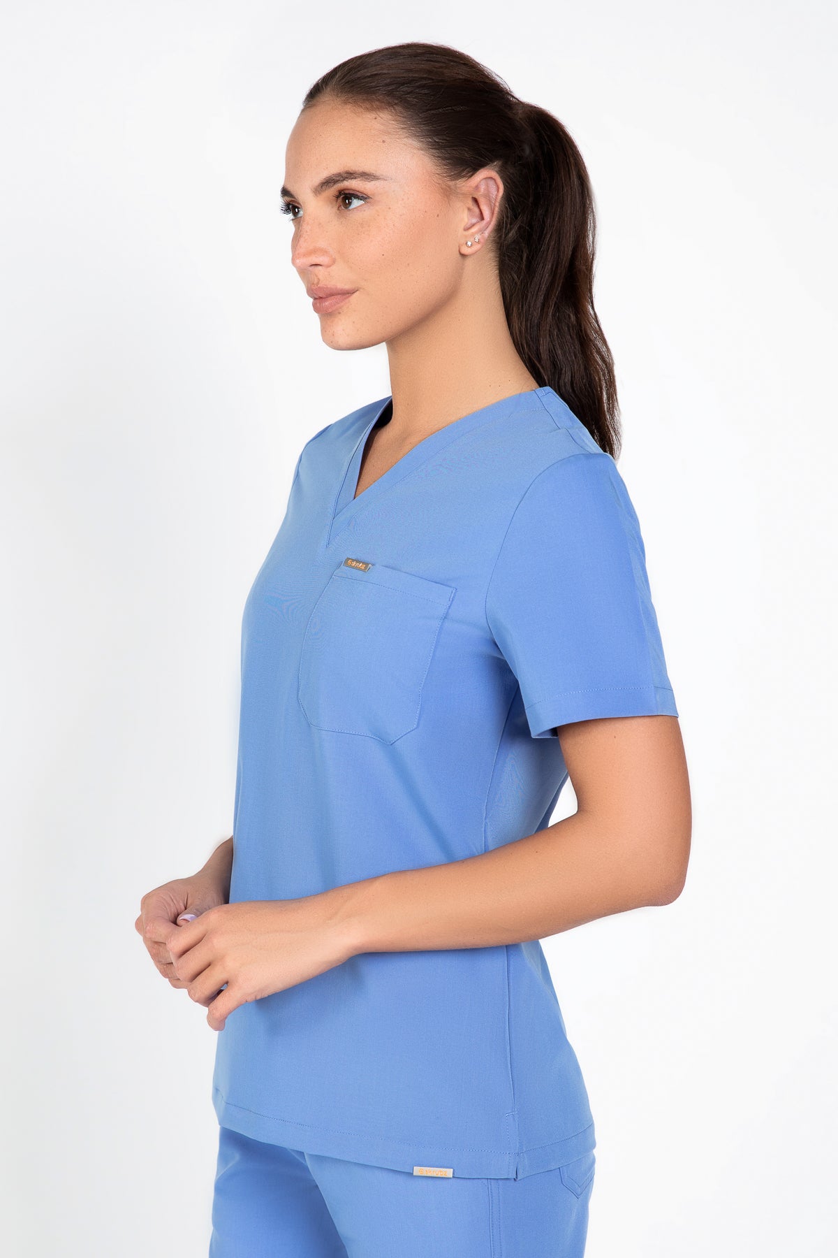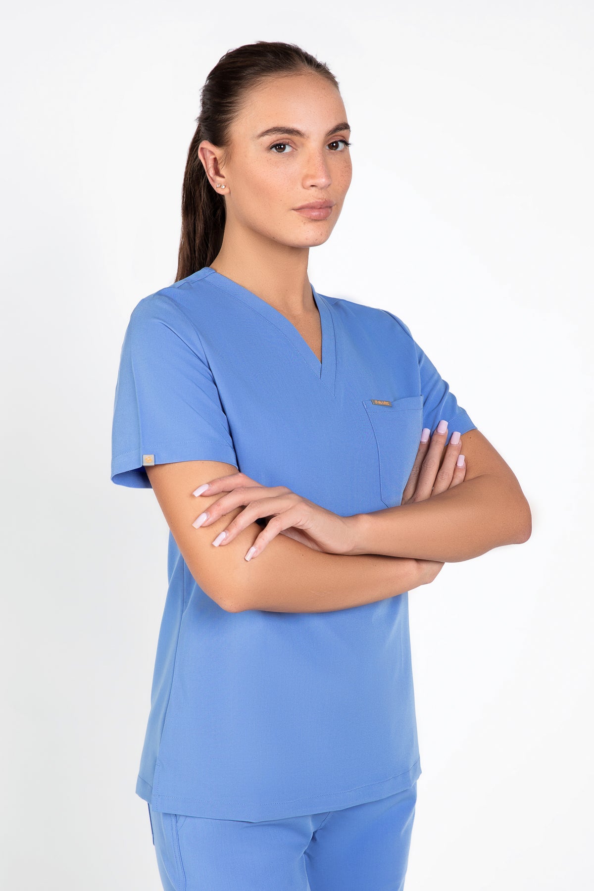Introducing SKRUBZ ESSENTIALS a concept based on the idea of long lasting fashion. Our Kaizen V Neck One Pocket Scrub Top is part of our everyday essentials range built on timeless design, high quality and excellent fit. The Kaizen top is a style that you can return to again and again, which forms the basis for a lasting and always contemporary wardrobe. This Kaizen V Neck One Pocket Scrub Top provides a relaxed fit, one side chest pocket great for keeping supplies handy. Characteristics of our essentials range are our metal labels featuring our engraved SKRUBZ logo, enhancing the appearance of the collection.The Kaizen top features 4 way stretch, breathability, anti microbial and anti-wrinkle fabric.