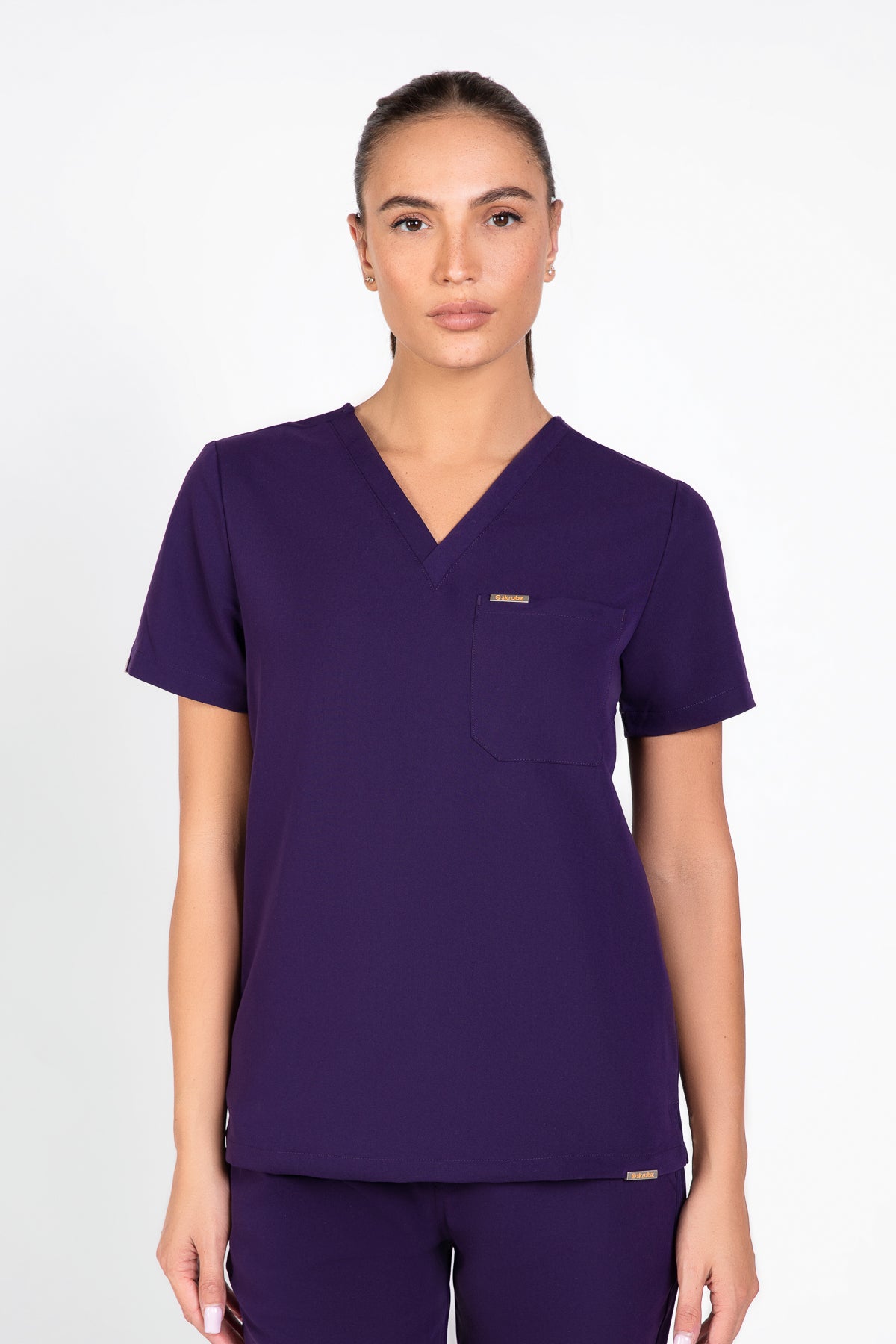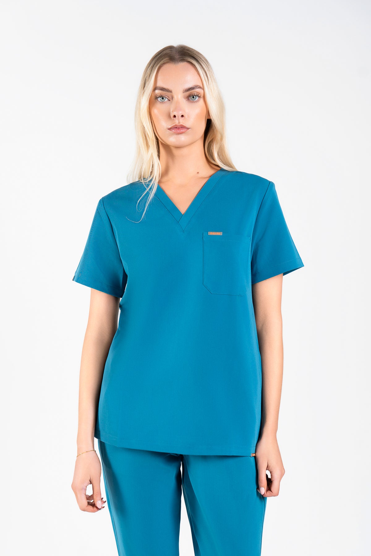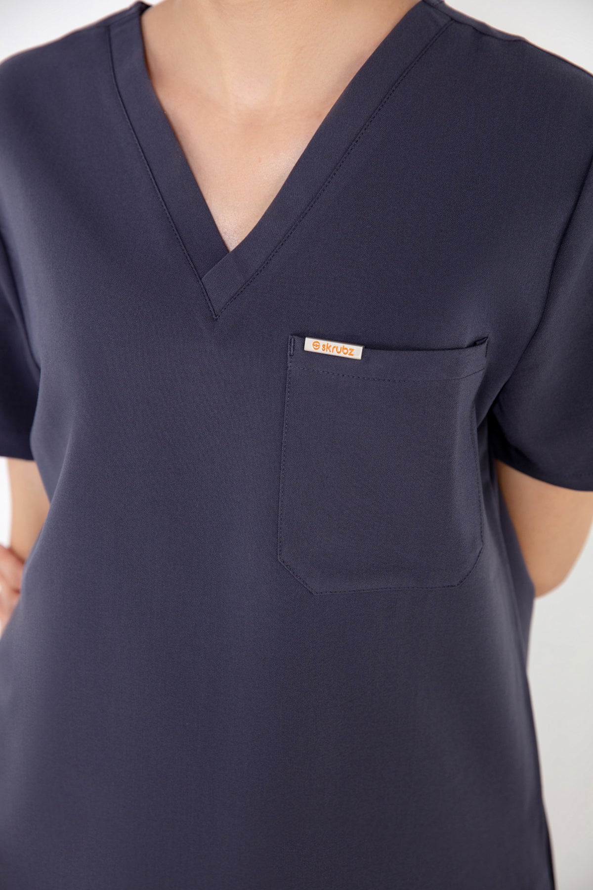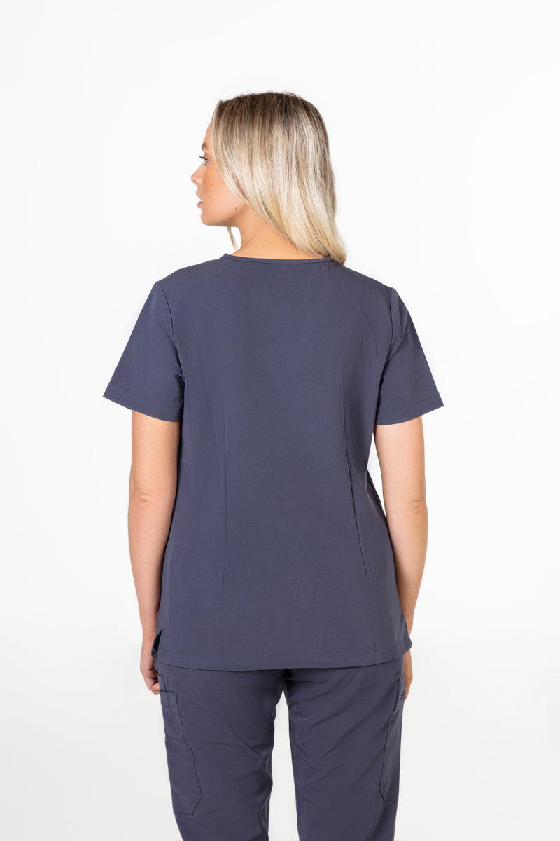 The navy scrub top is excellent! It’s comfortable, looks sharp, and the pocket is conveniently located. It holds up well throughout the day and maintains its colour after washing.