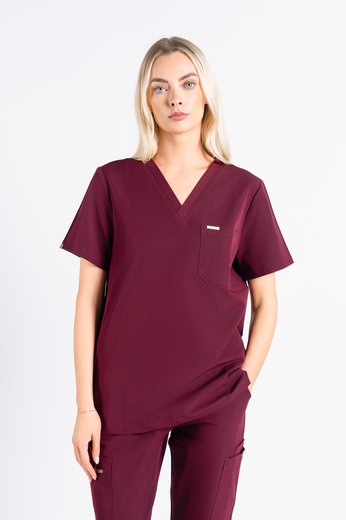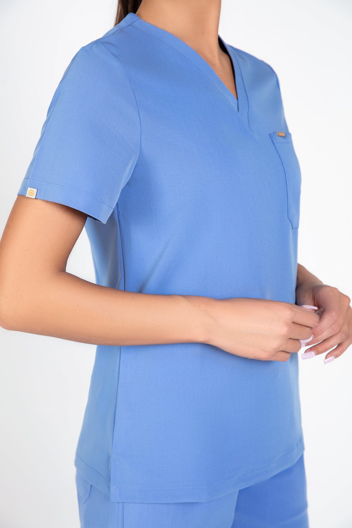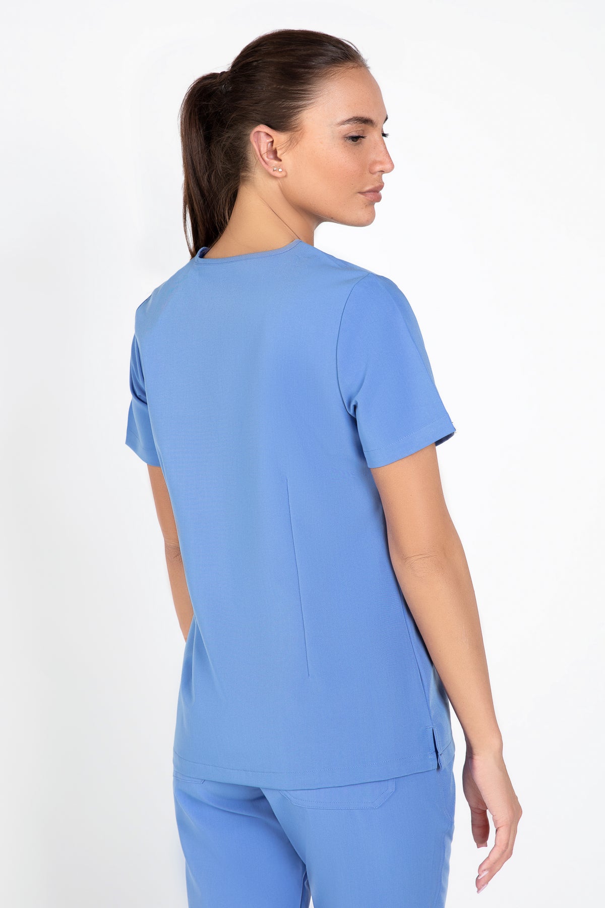 The navy scrub top is excellent! It’s comfortable, looks sharp, and the pocket is conveniently located. It holds up well throughout the day and maintains its colour after washing.