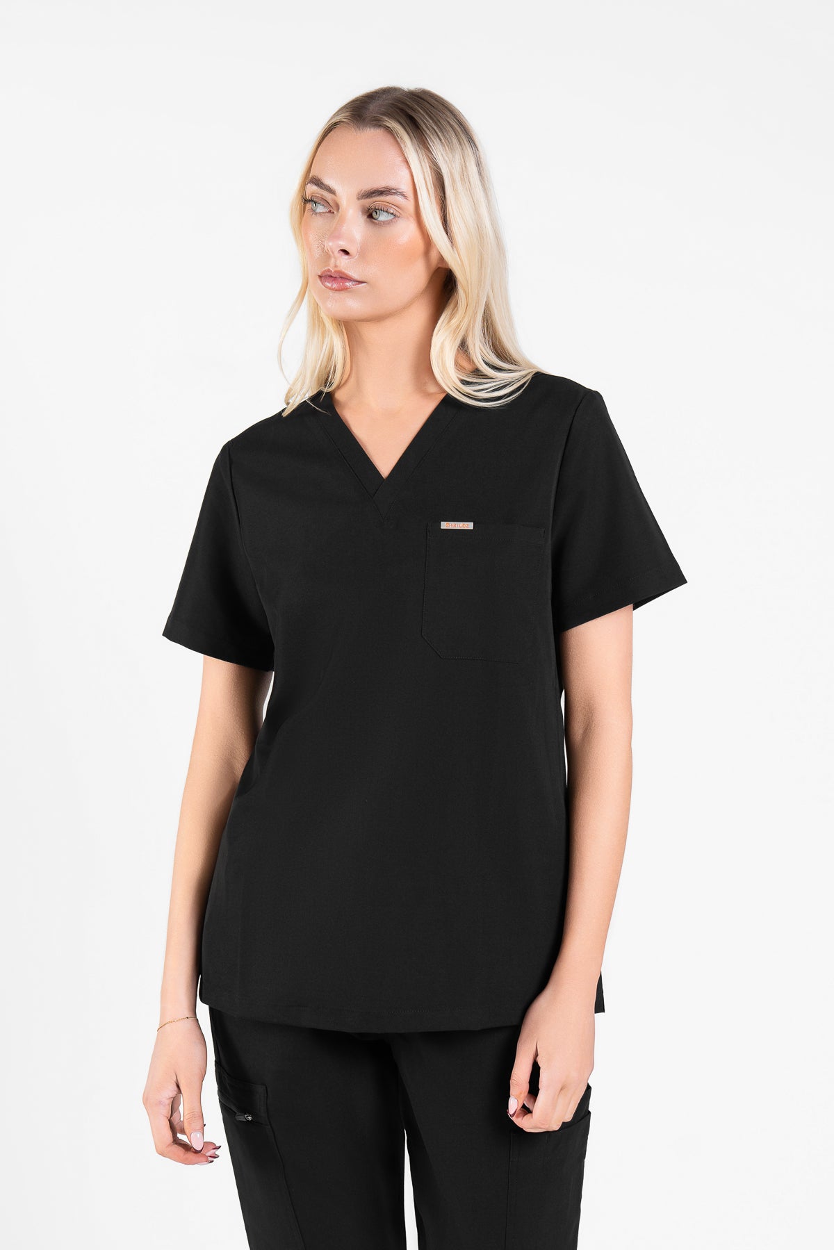This black scrub is both functional and stylish. The material is comfortable for all-day wear, and the pocket is perfect for small tools and notes