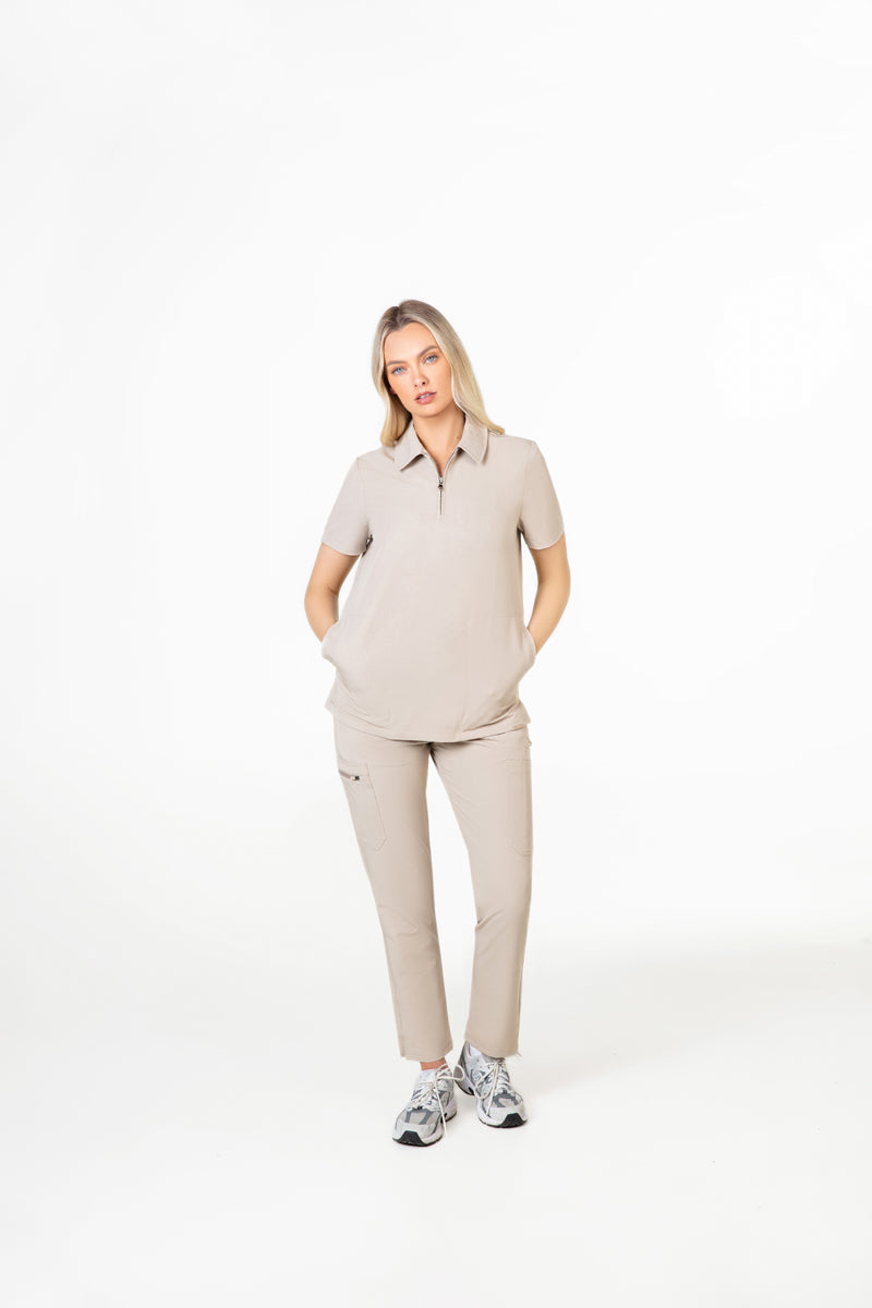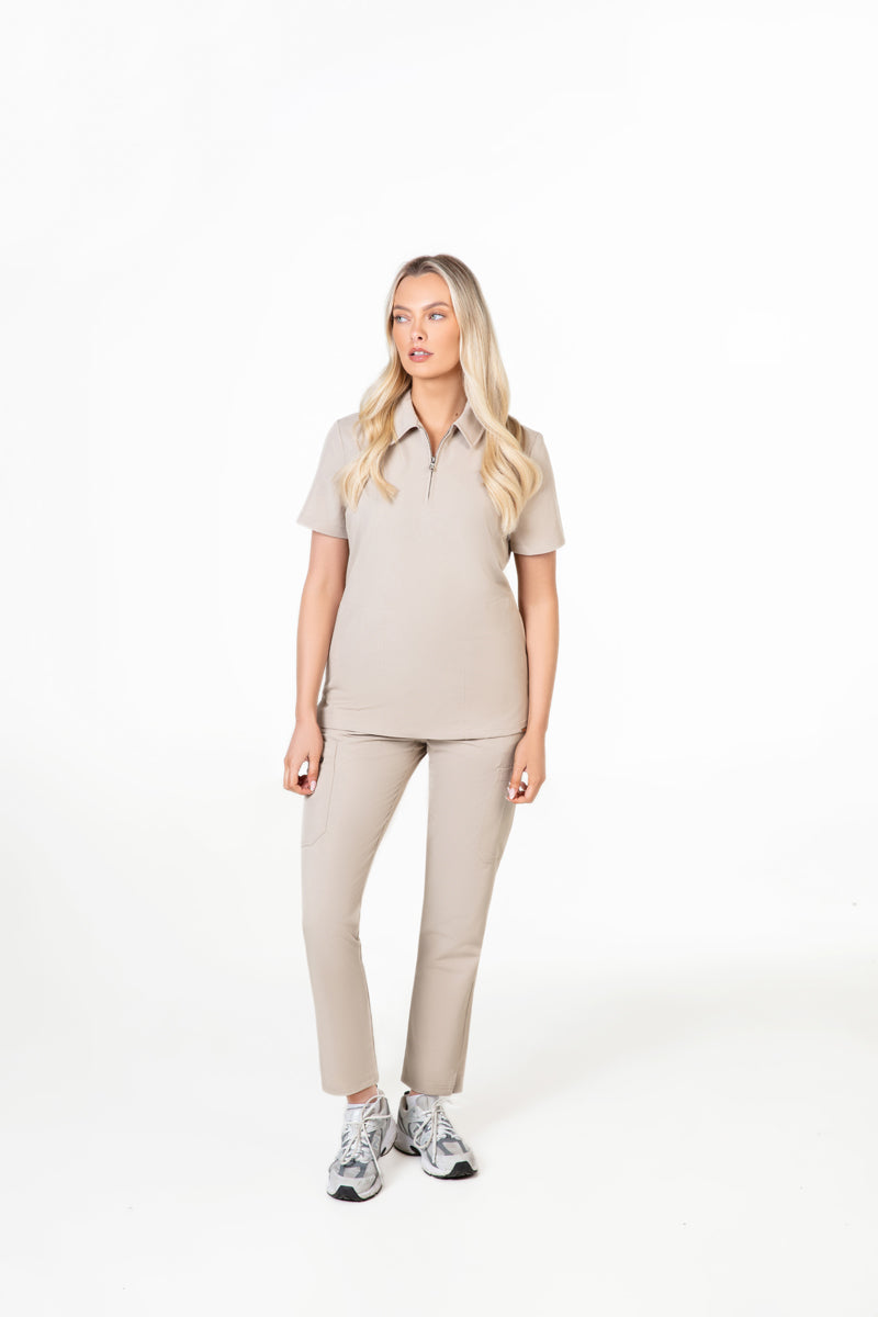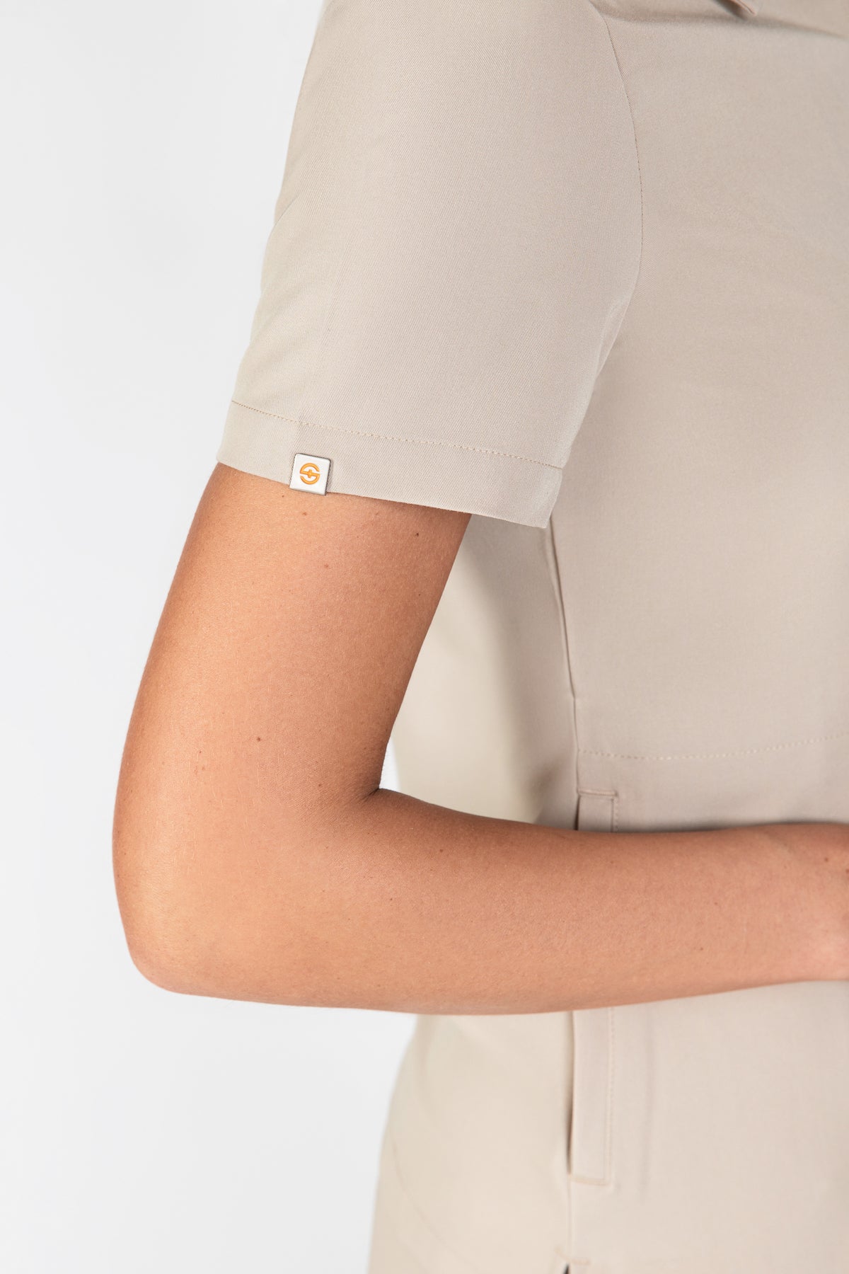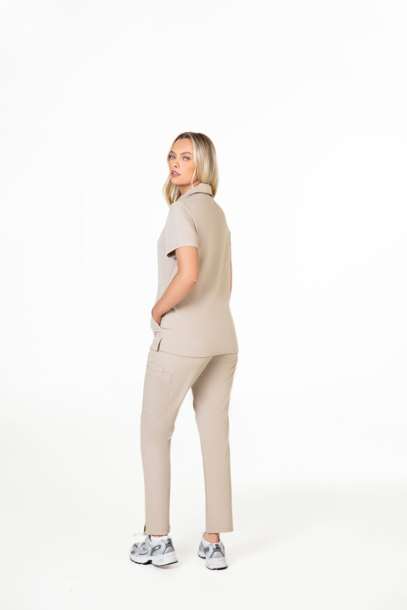 The sand stone scrub top is both stylish and functional. The fit is perfect, and the colour is great for a professional environment.
