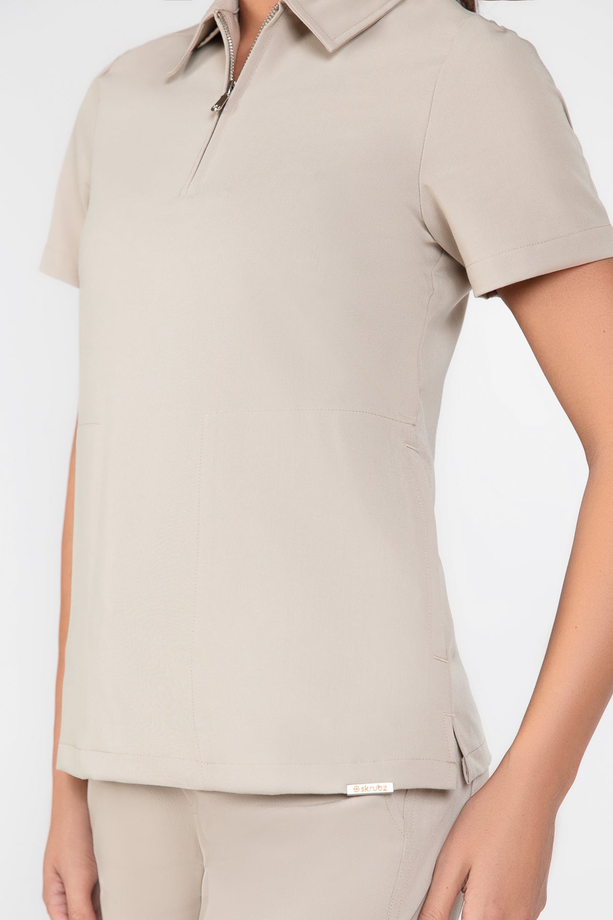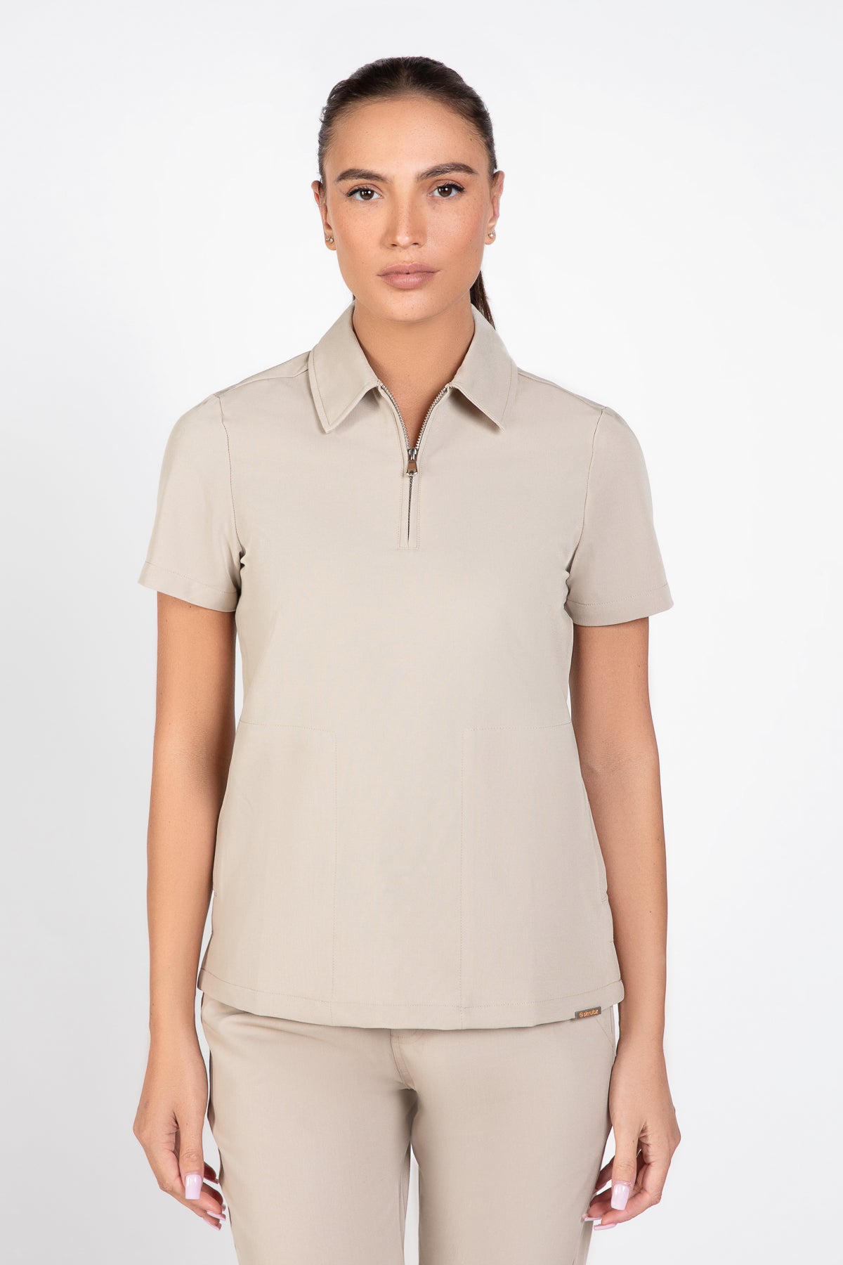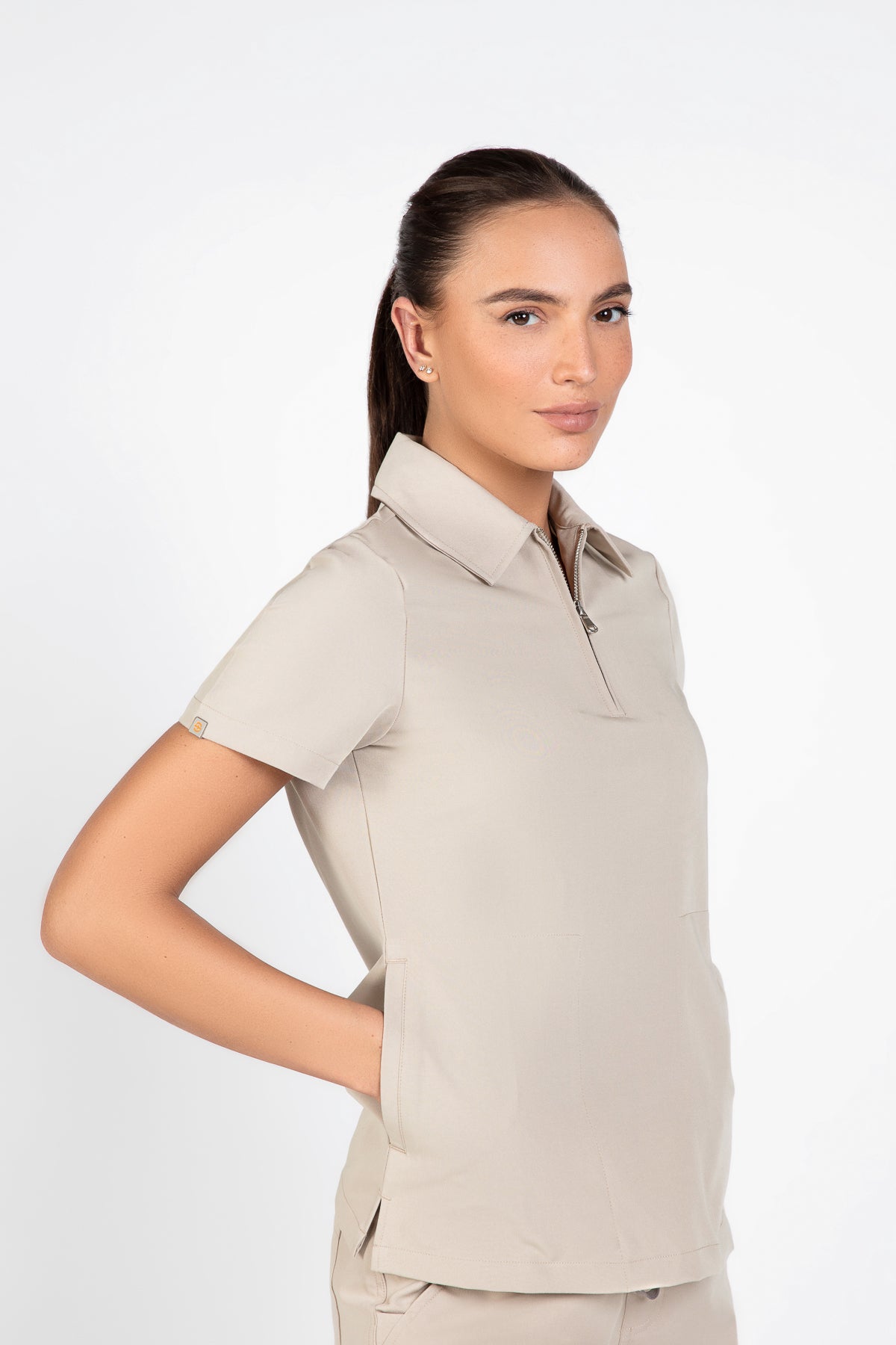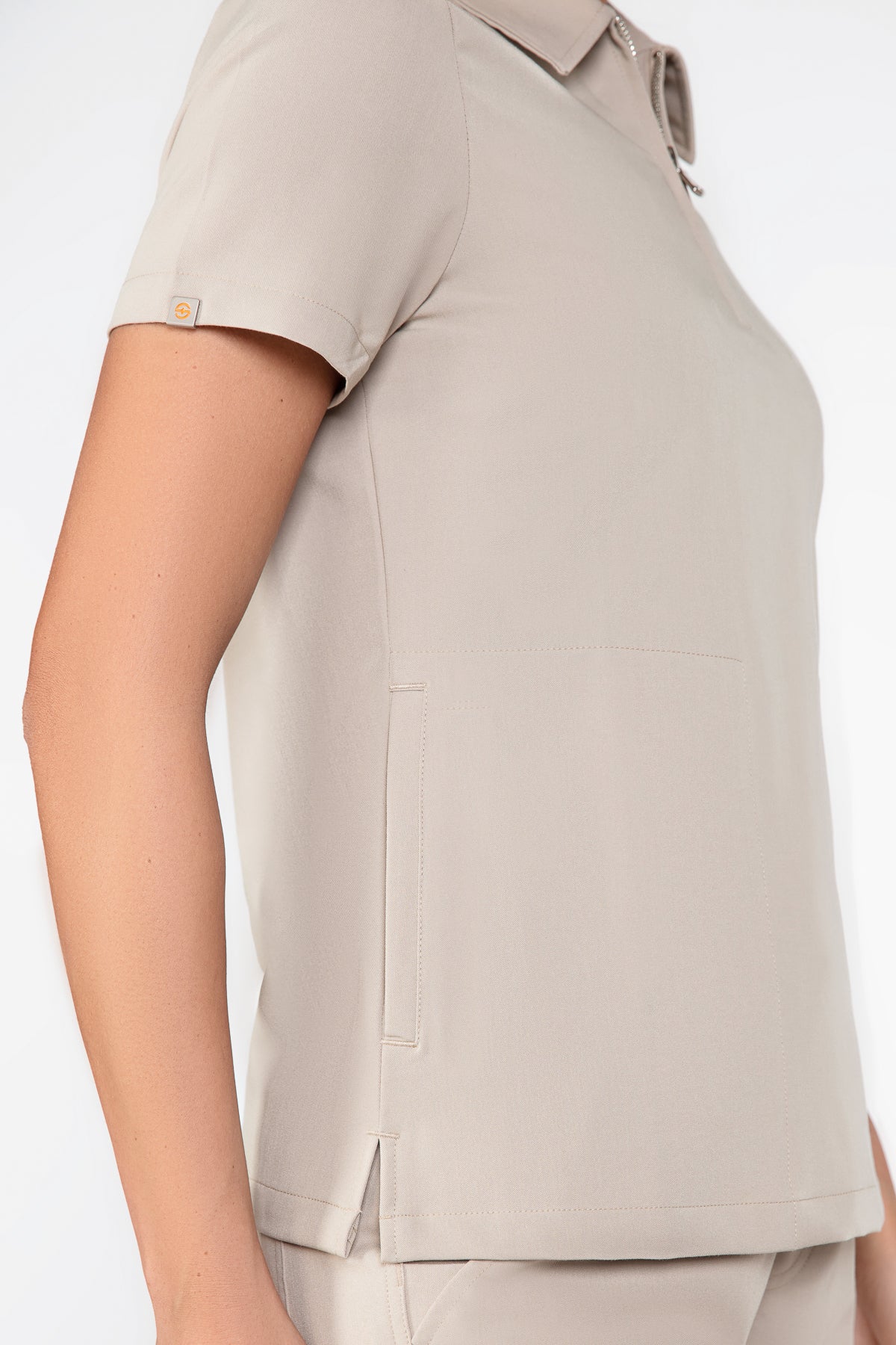 Elevate your wardrobe with our SKRUBZ branded Kiro Side Pocket Zip Neck Top for Women, which merges both traditional sophistication with modern functionalities. The short sleeve zip neck top is crafted with a slim fit and soft fabric. As we always pride ourselves in fine details, a fine fit and quality of trims are thought-out. Its cut is relaxed and detailed with a casual half-zip placket and chrome zipper at the neck helping to go on and off with ease. The side slits are cut for movement. The Kiro polo is perfect for smart-causal styling as it features a cutaway collar and curved hemline. This style lends a relaxed feel to smart looks and we feel the top is timeless and considered. The Kiro top features 4-way stretch, breathability, anti-microbial and anti-wrinkle fabric.