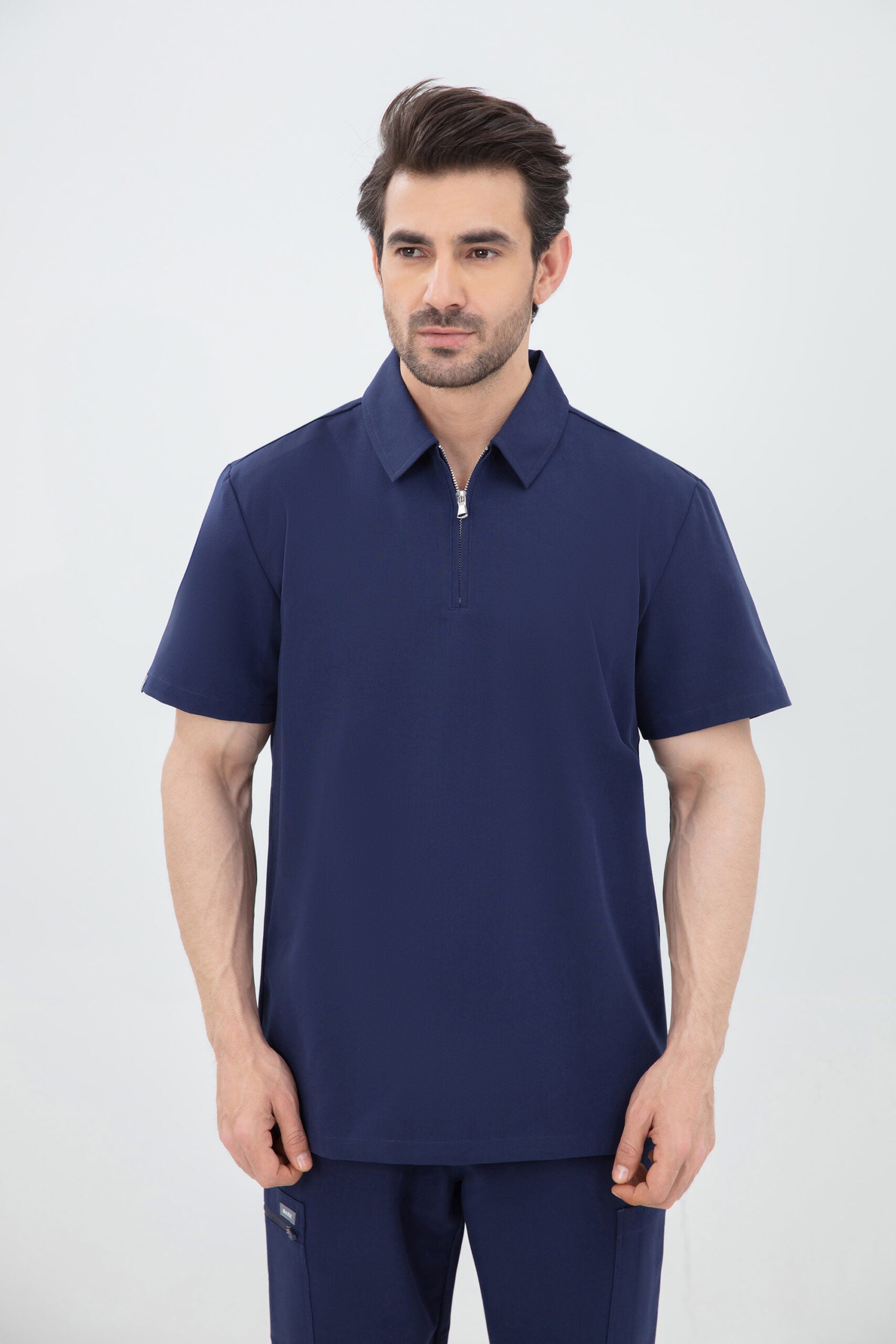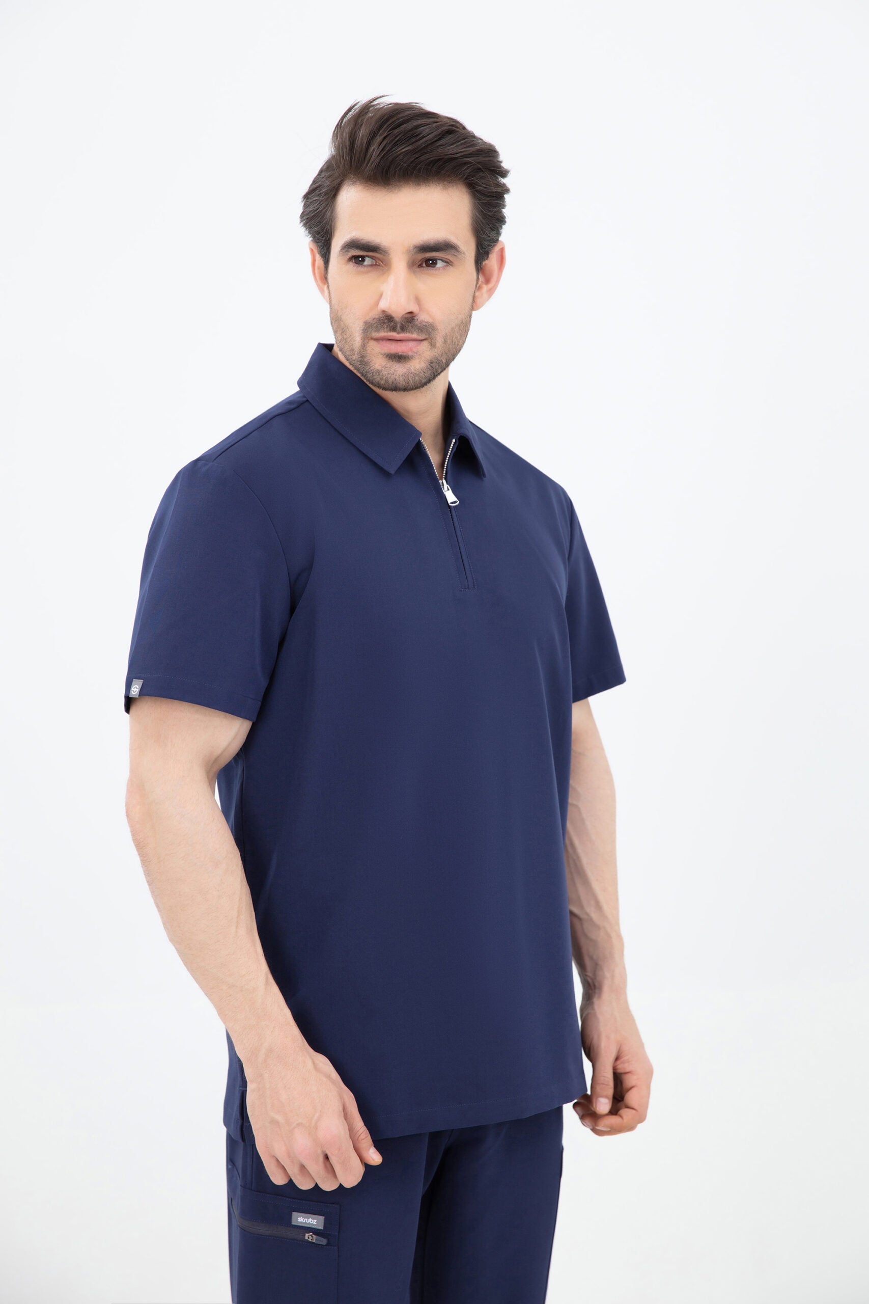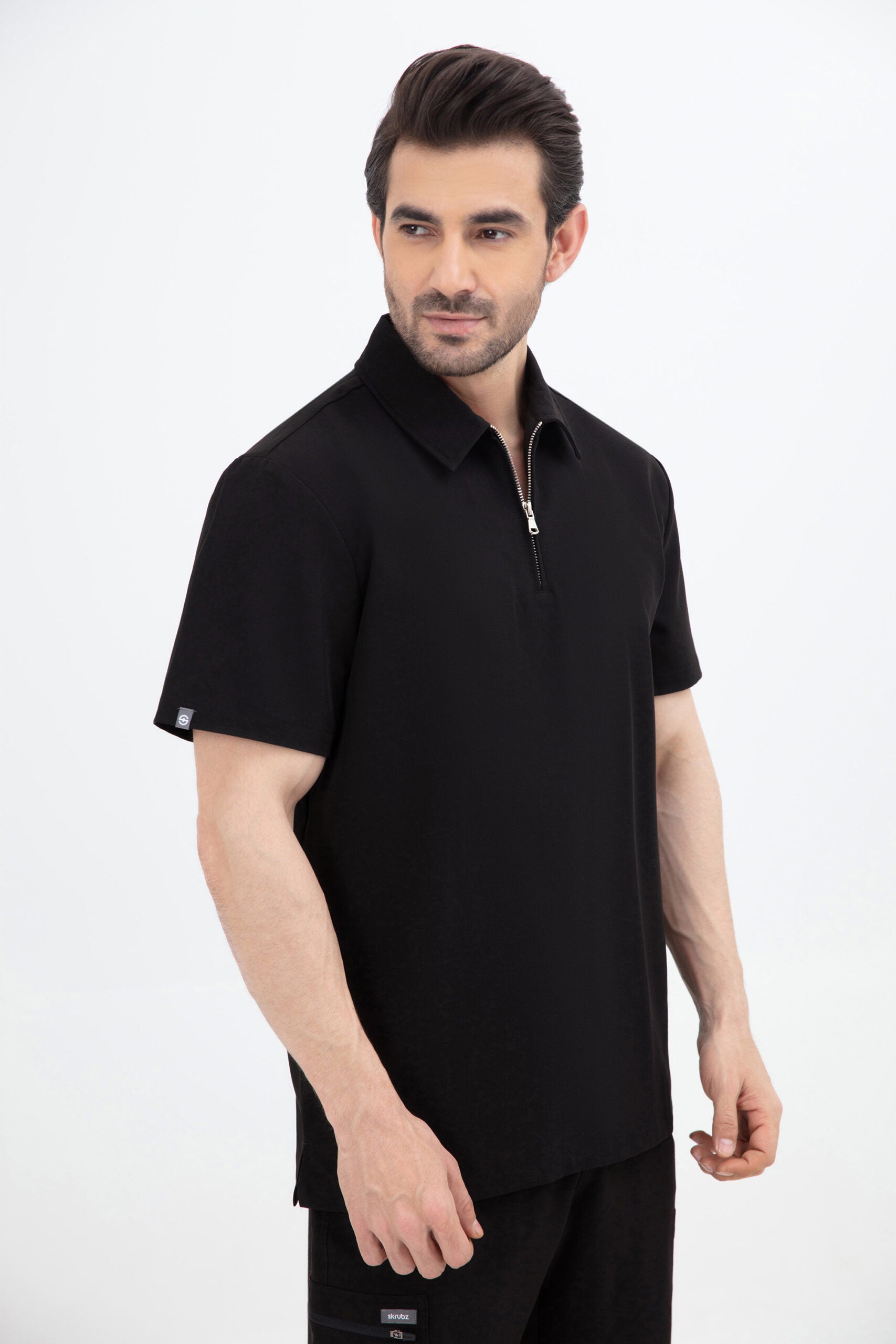 Elevate your wardrobe with our SKRUBZ branded Kiro Zip Neck Polo For Mens, which merges both traditional sophistication with modern functionalities. The short sleeve polo top is crafted with a slim fit and soft fabric. As we always pride ourselves in fine details, a fine fit and quality of trims are thought-out. Its cut is relaxed and detailed with a casual half-zip placket and chrome zipper at the neck helping to go on and off with ease. The side slits are cut for movement. The Kiro Zip Neck Polo is perfect for smart-causal styling as it features a cutaway collar and curved hemline. This style lends a relaxed feel to smart looks and we feel the top is timeless and considered. The Kiro top features 4-way stretch, breathability, anti-microbial and anti-wrinkle fabric.