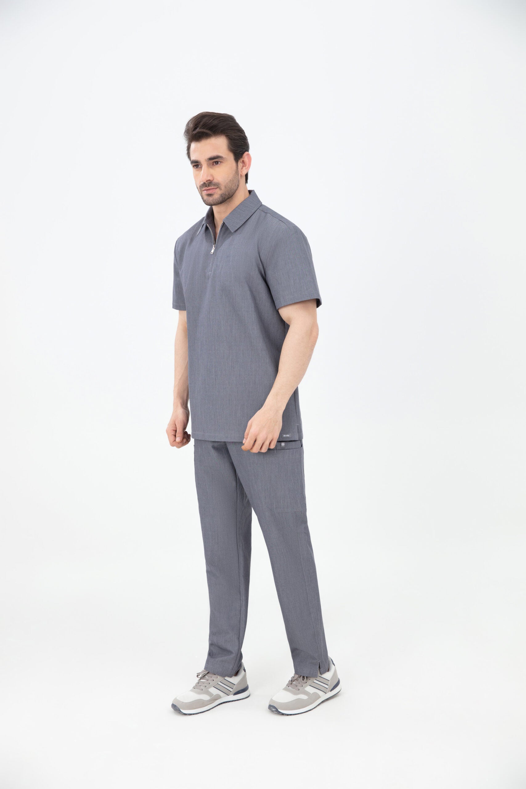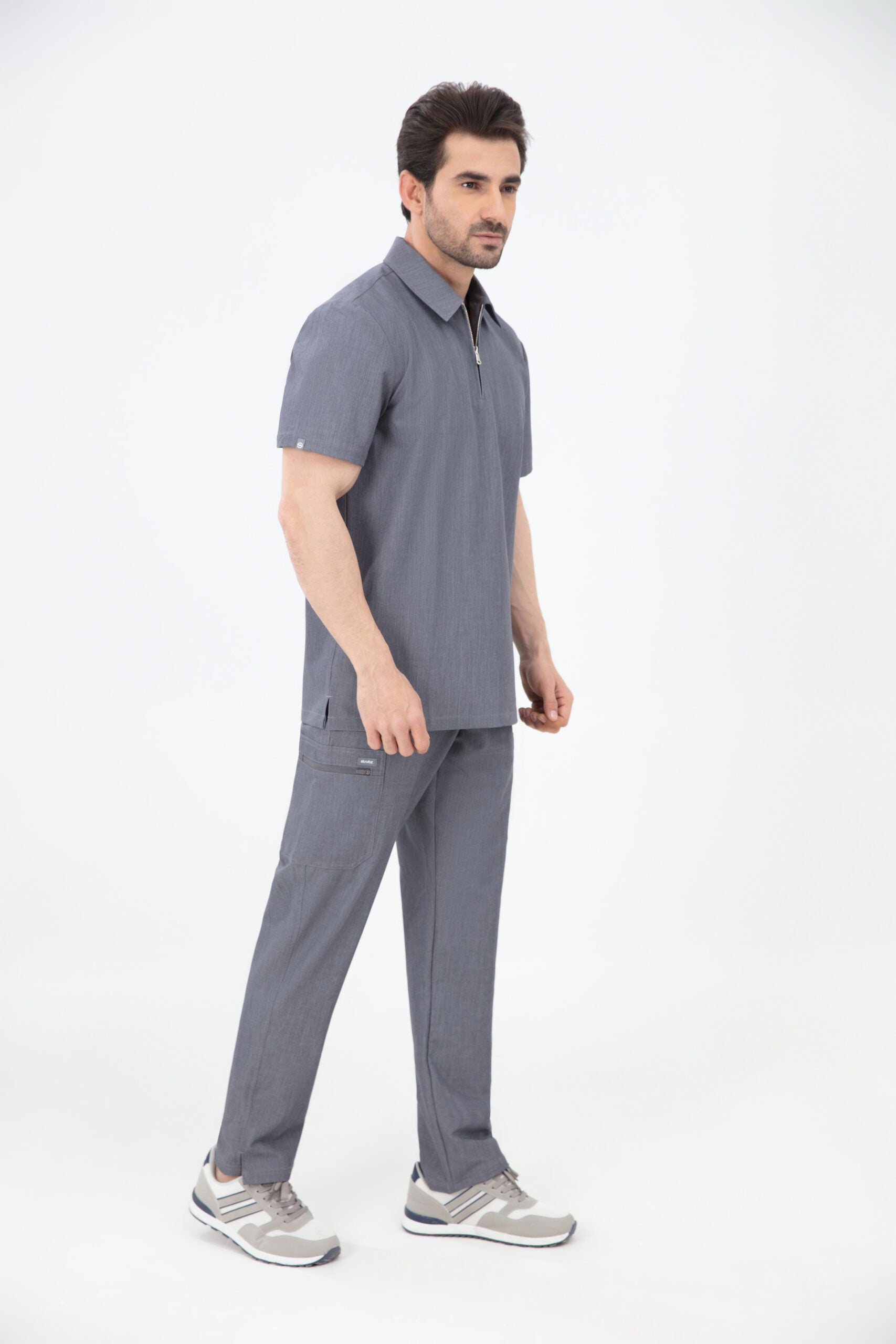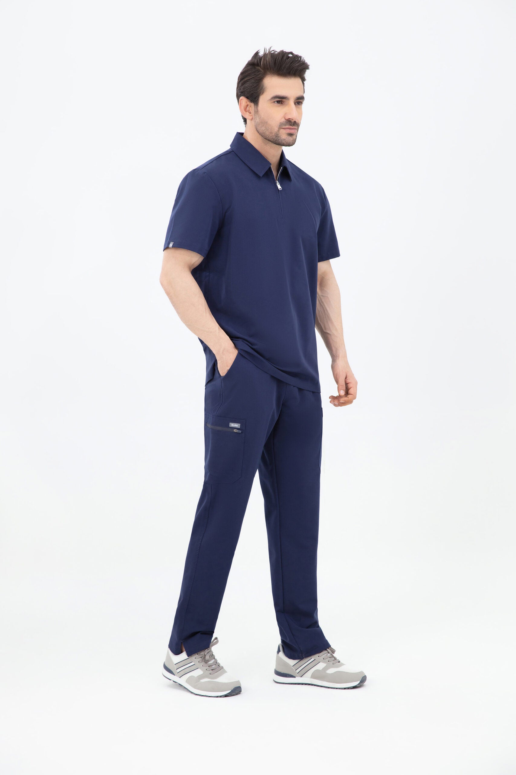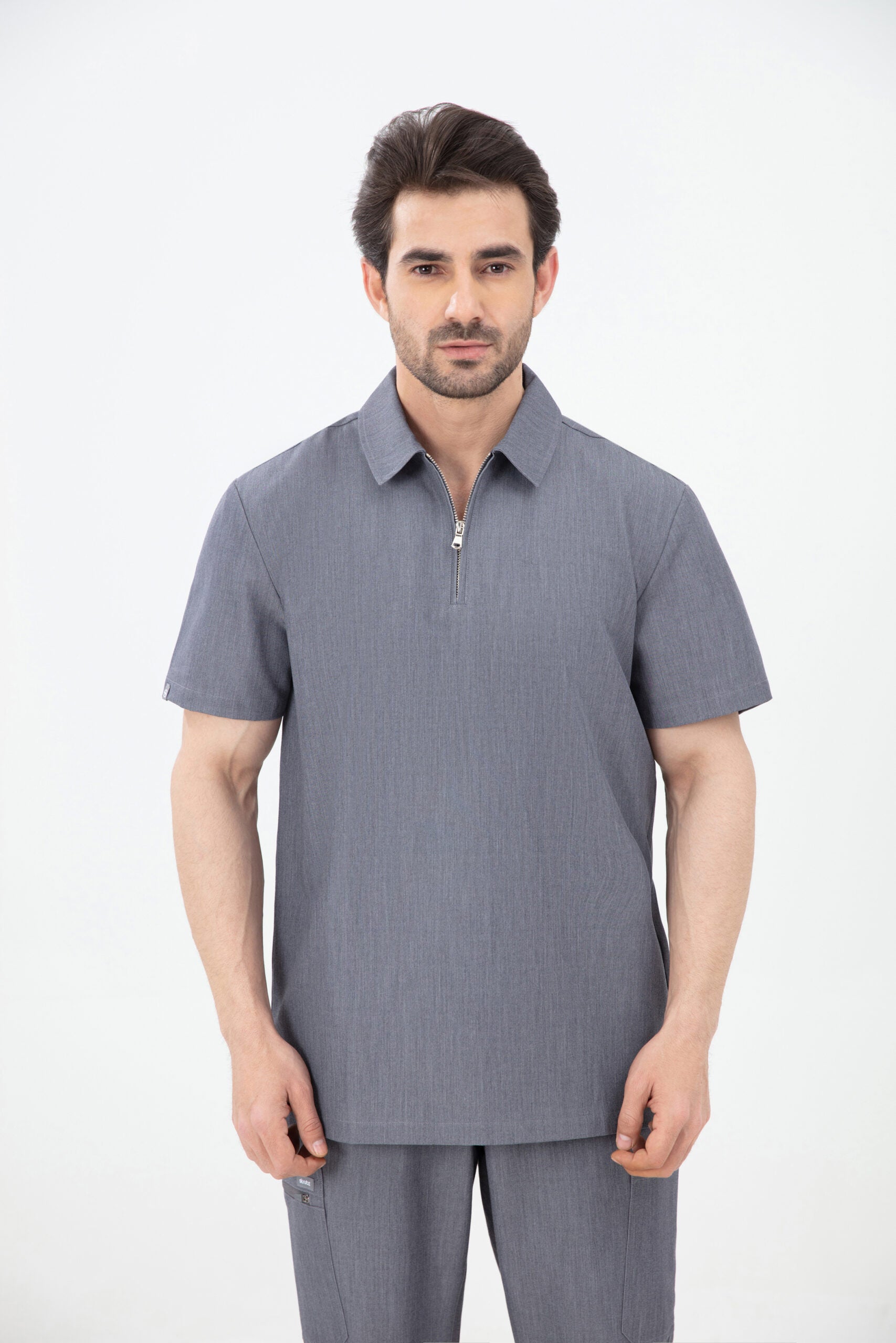 Elevate your wardrobe with our SKRUBZ branded Kiro Zip Neck Polo For Mens, which merges both traditional sophistication with modern functionalities. The short sleeve polo top is crafted with a slim fit and soft fabric. As we always pride ourselves in fine details, a fine fit and quality of trims are thought-out. Its cut is relaxed and detailed with a casual half-zip placket and chrome zipper at the neck helping to go on and off with ease. The side slits are cut for movement. The Kiro Zip Neck Polo is perfect for smart-causal styling as it features a cutaway collar and curved hemline. This style lends a relaxed feel to smart looks and we feel the top is timeless and considered. The Kiro top features 4-way stretch, breathability, anti-microbial and anti-wrinkle fabric.