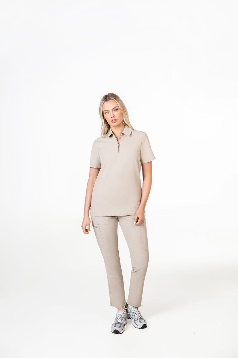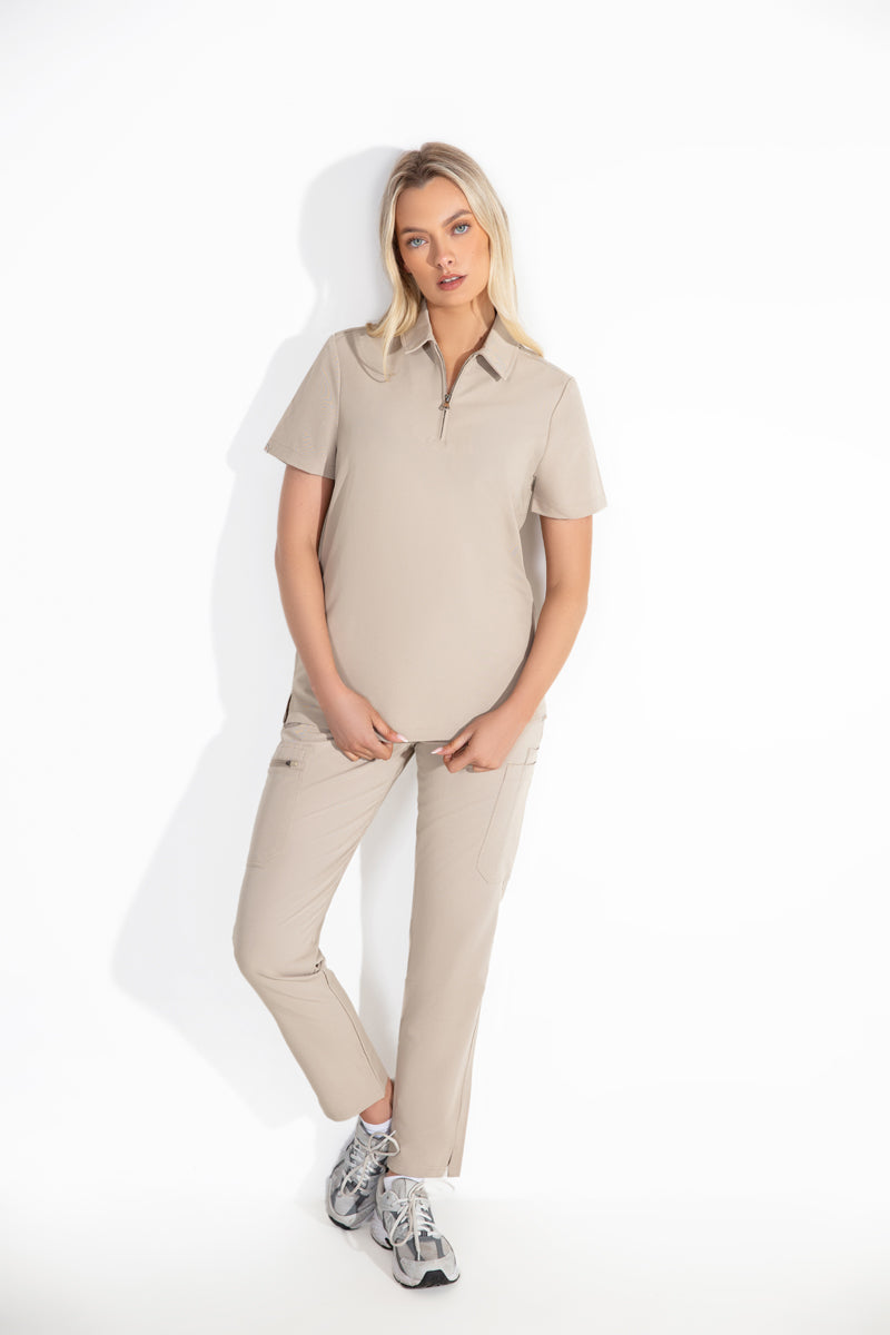 The Sand Stone colour is so unique and elegant. This scrub is perfect for any professional setting. The zip neck is a brilliant feature, making it both functional and fashionable.