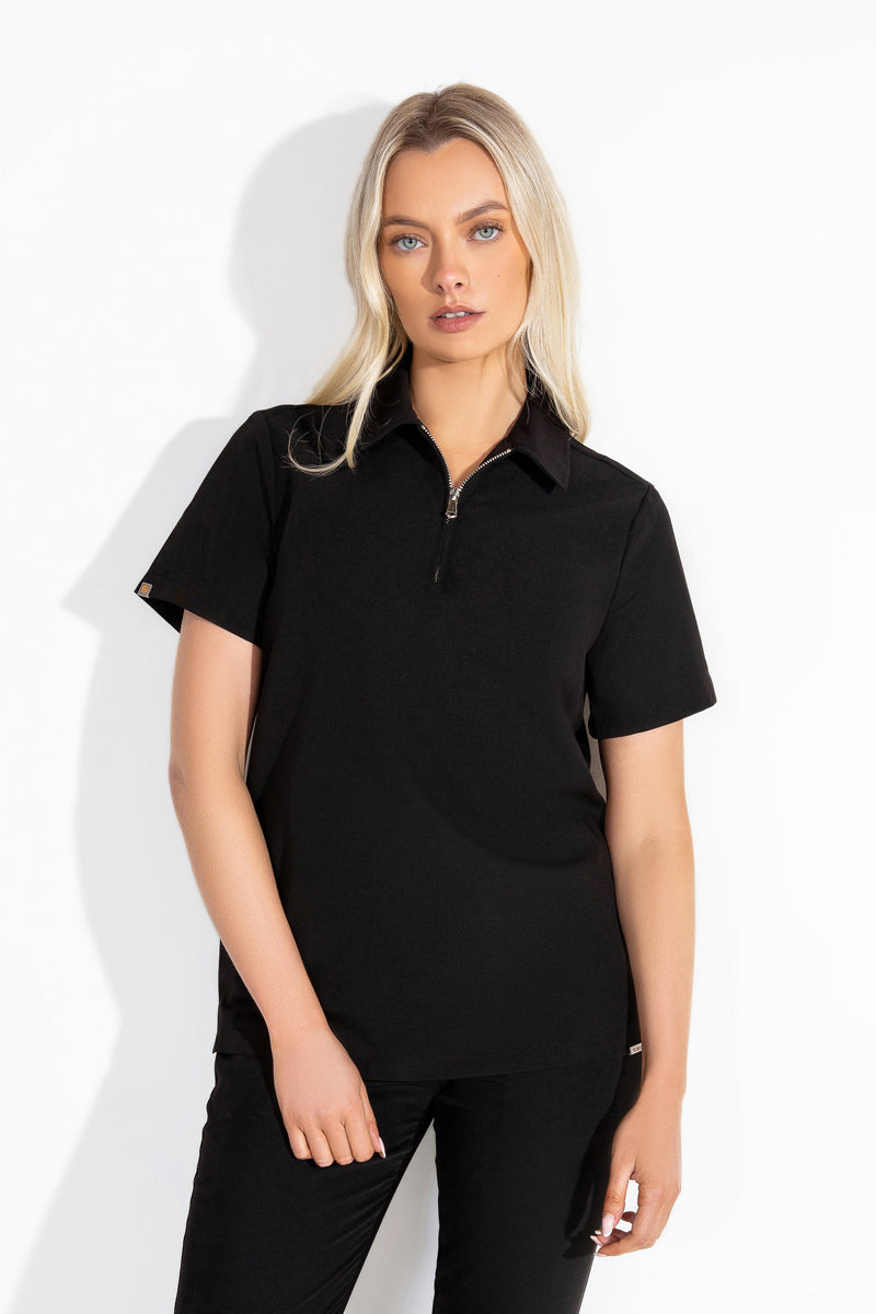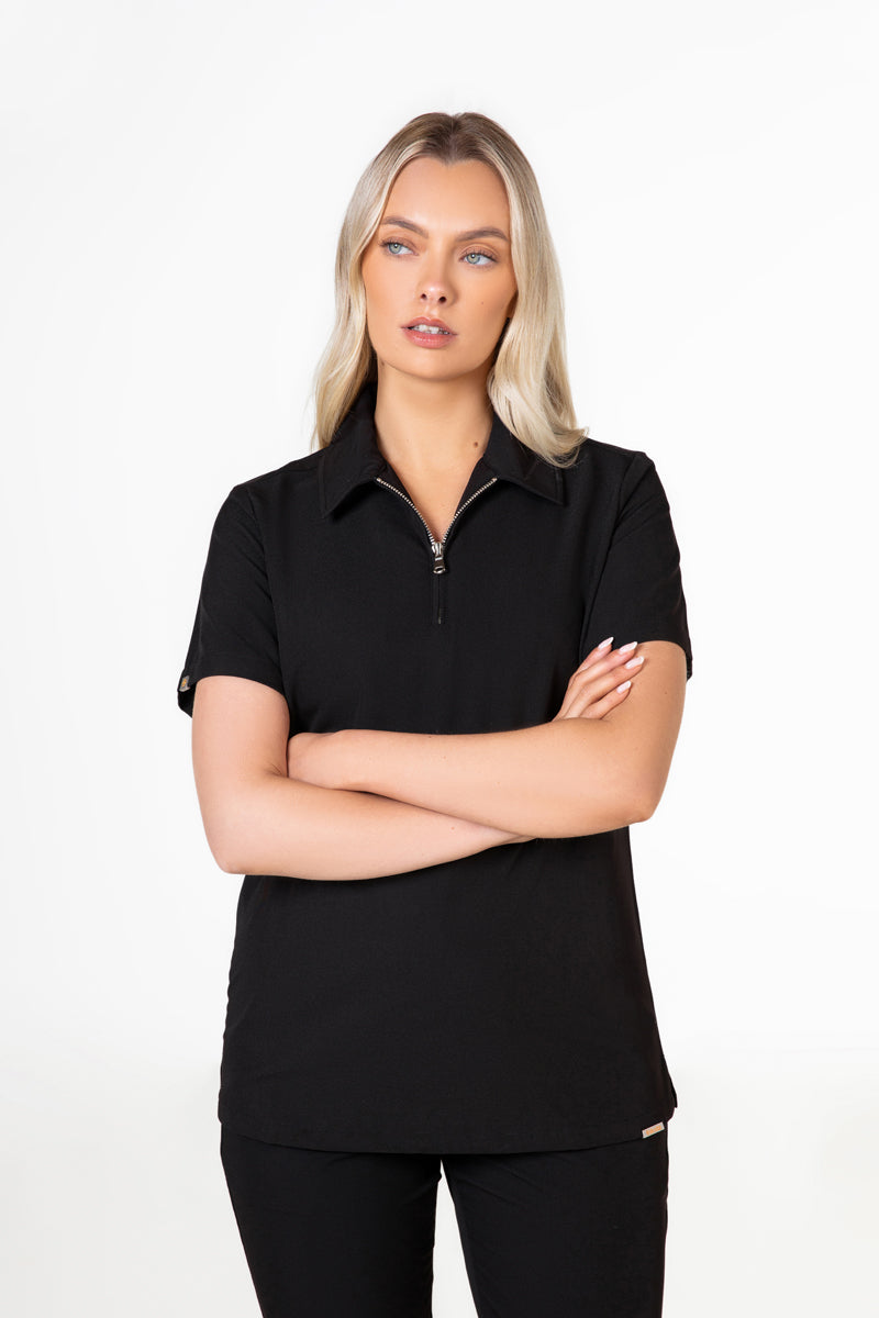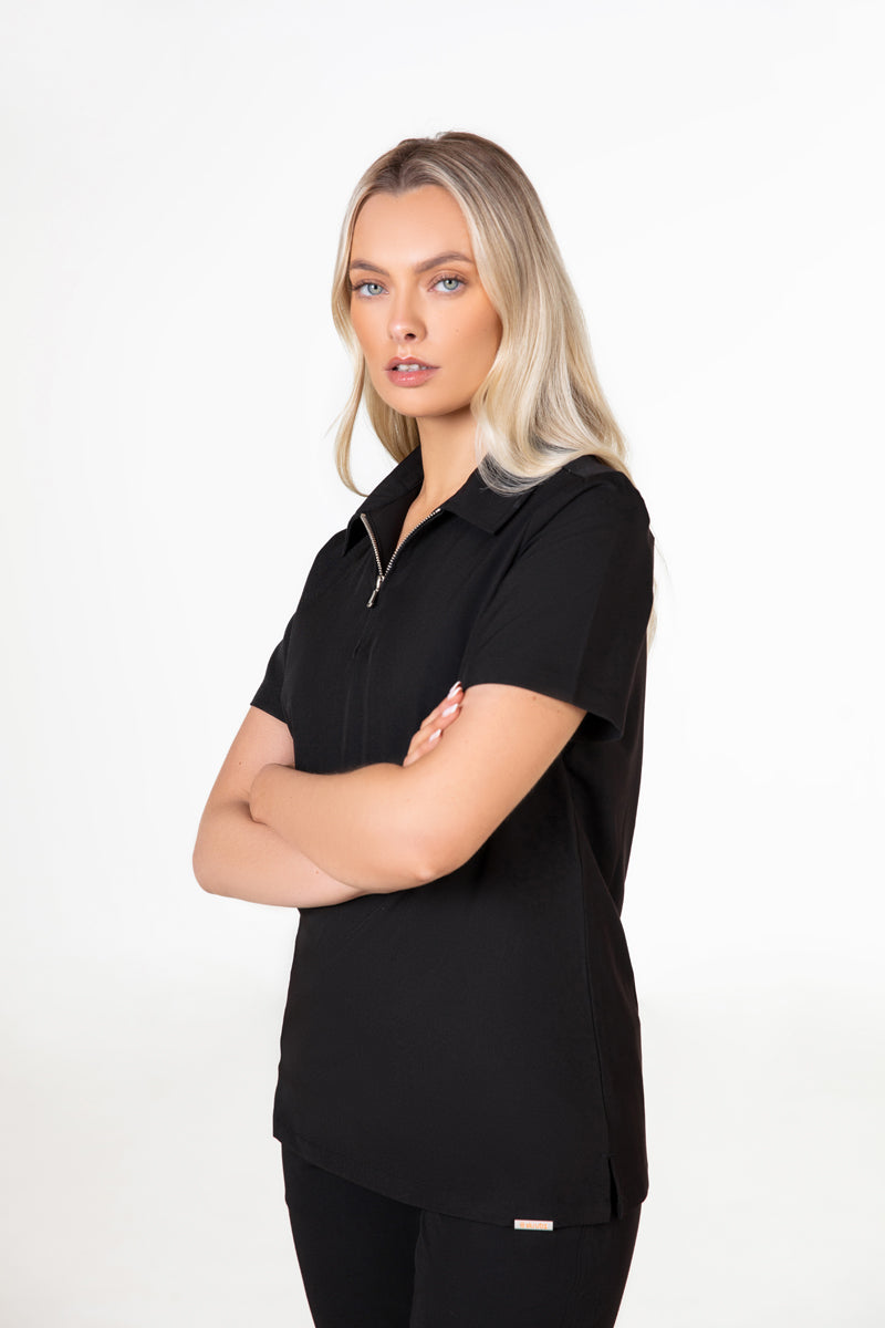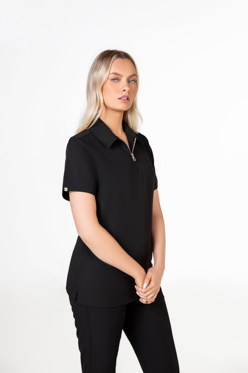 Elevate your wardrobe with our SKRUBZ branded Kiro Zip Neck Polo Scrub For Womens NewGen. Now New and improved merging both traditional sophistication with modern functionalities. The short sleeve polo top is crafted with a slim fit and soft fabric. As we always pride ourselves in fine details, a fine fit and quality of trims are thought-out. Its cut is relaxed and detailed with a casual half-zip placket and chrome zipper at the neck helping to go on and off with ease. The side slits are cut for movement. The Kiro polo is perfect for smart-causal styling as it features a cutaway collar and curved hemline. This style lends a relaxed feel to smart looks and we feel the top is timeless and considered. The Kiro top features 4-way stretch, breathability, anti-microbial and anti-wrinkle fabric.