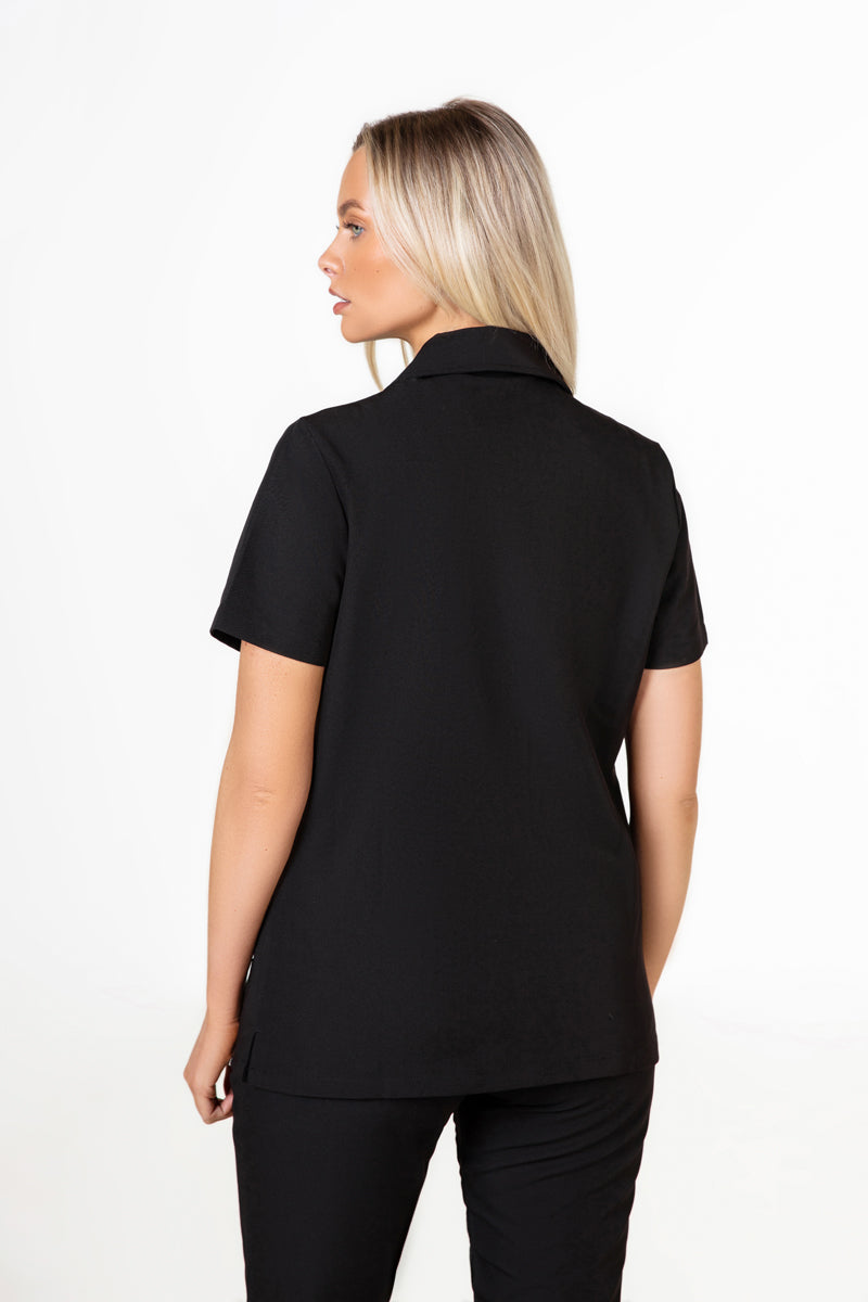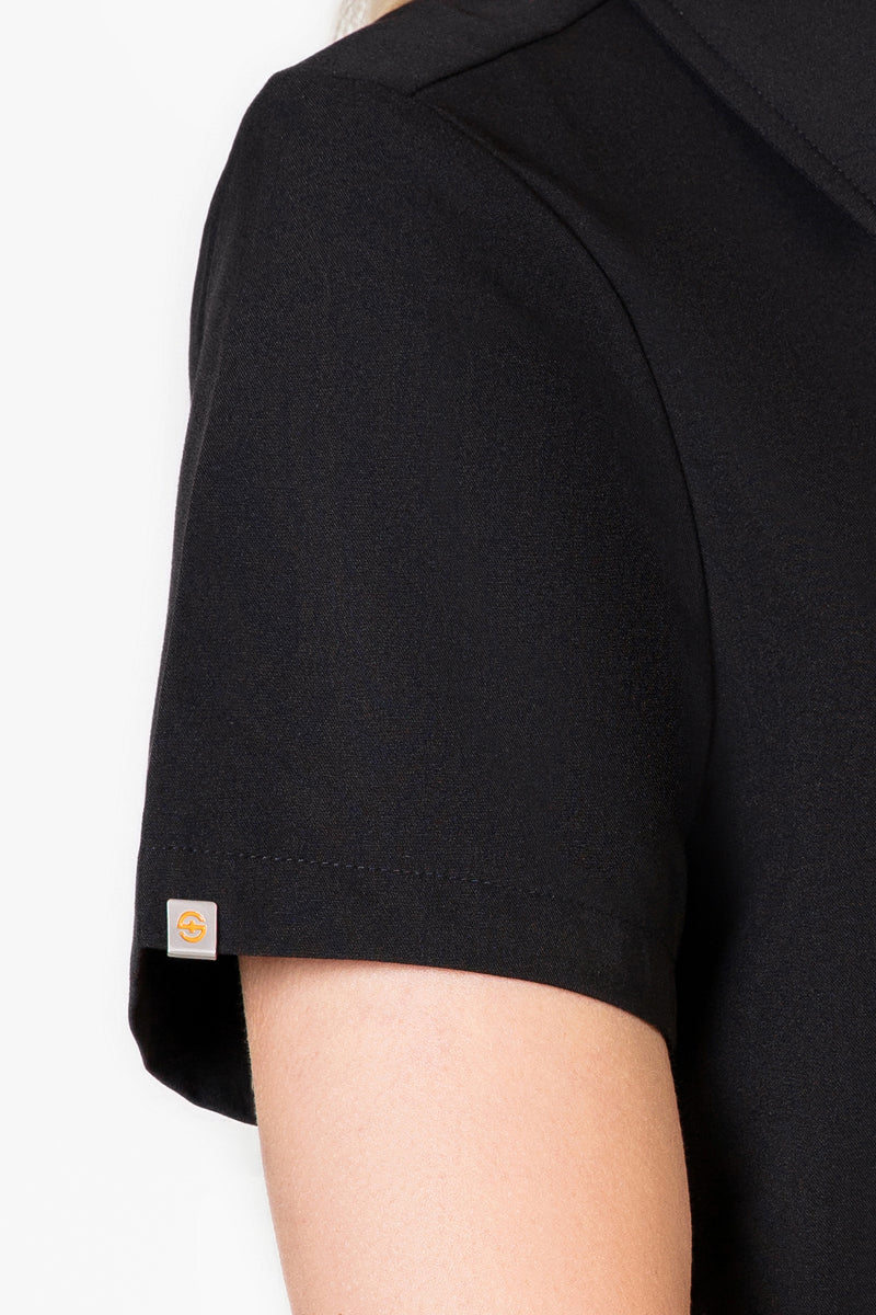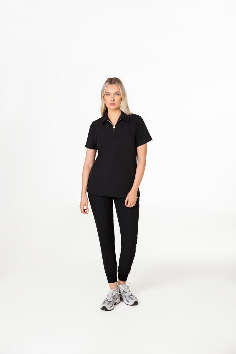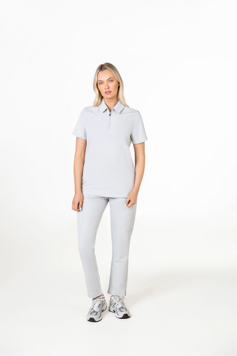 Elevate your wardrobe with our SKRUBZ branded Kiro Zip Neck Polo Scrub For Womens NewGen. Now New and improved merging both traditional sophistication with modern functionalities. The short sleeve polo top is crafted with a slim fit and soft fabric. As we always pride ourselves in fine details, a fine fit and quality of trims are thought-out. Its cut is relaxed and detailed with a casual half-zip placket and chrome zipper at the neck helping to go on and off with ease. The side slits are cut for movement. The Kiro polo is perfect for smart-causal styling as it features a cutaway collar and curved hemline. This style lends a relaxed feel to smart looks and we feel the top is timeless and considered. The Kiro top features 4-way stretch, breathability, anti-microbial and anti-wrinkle fabric.