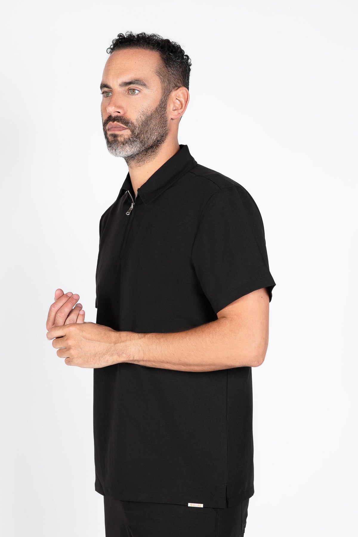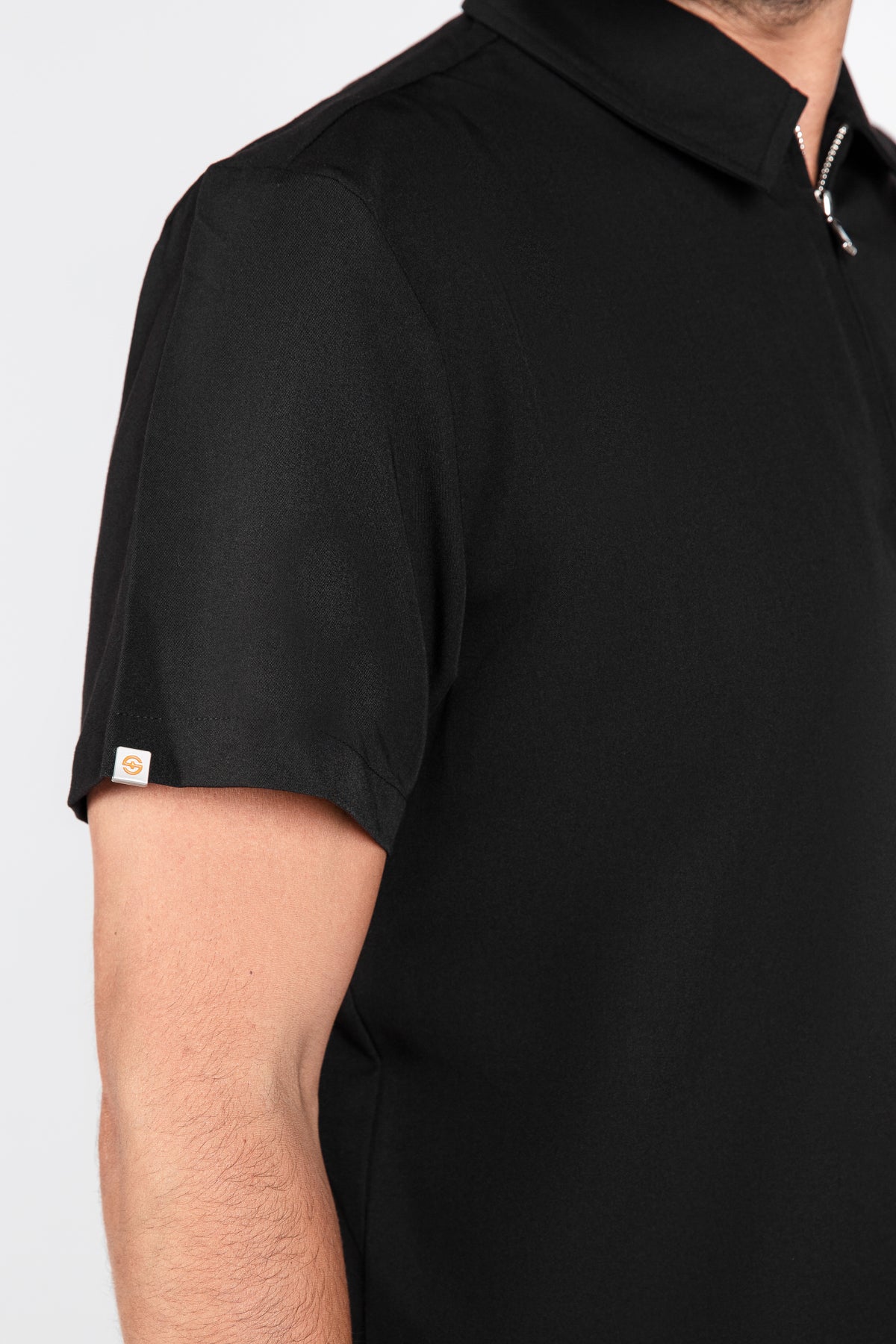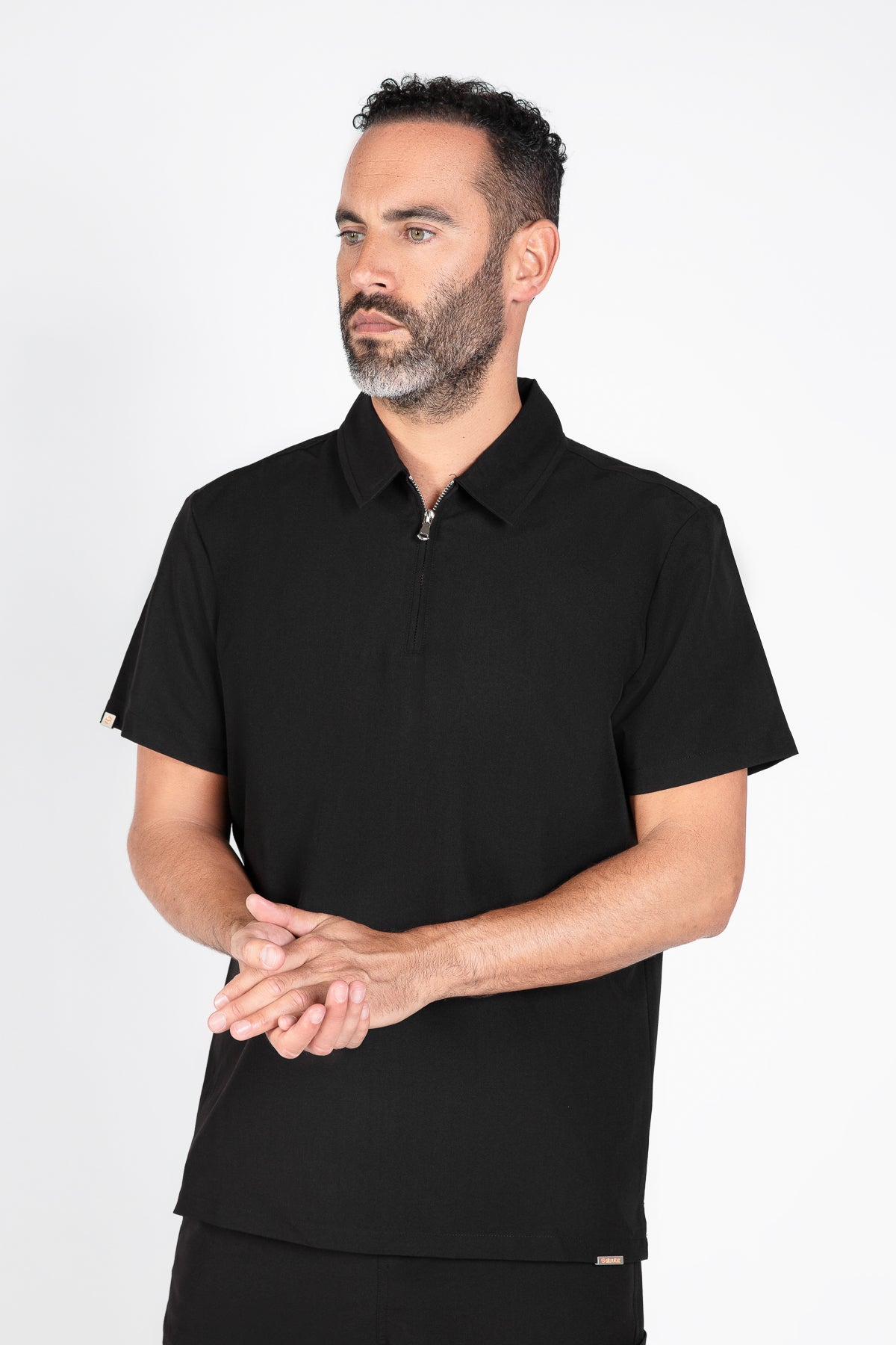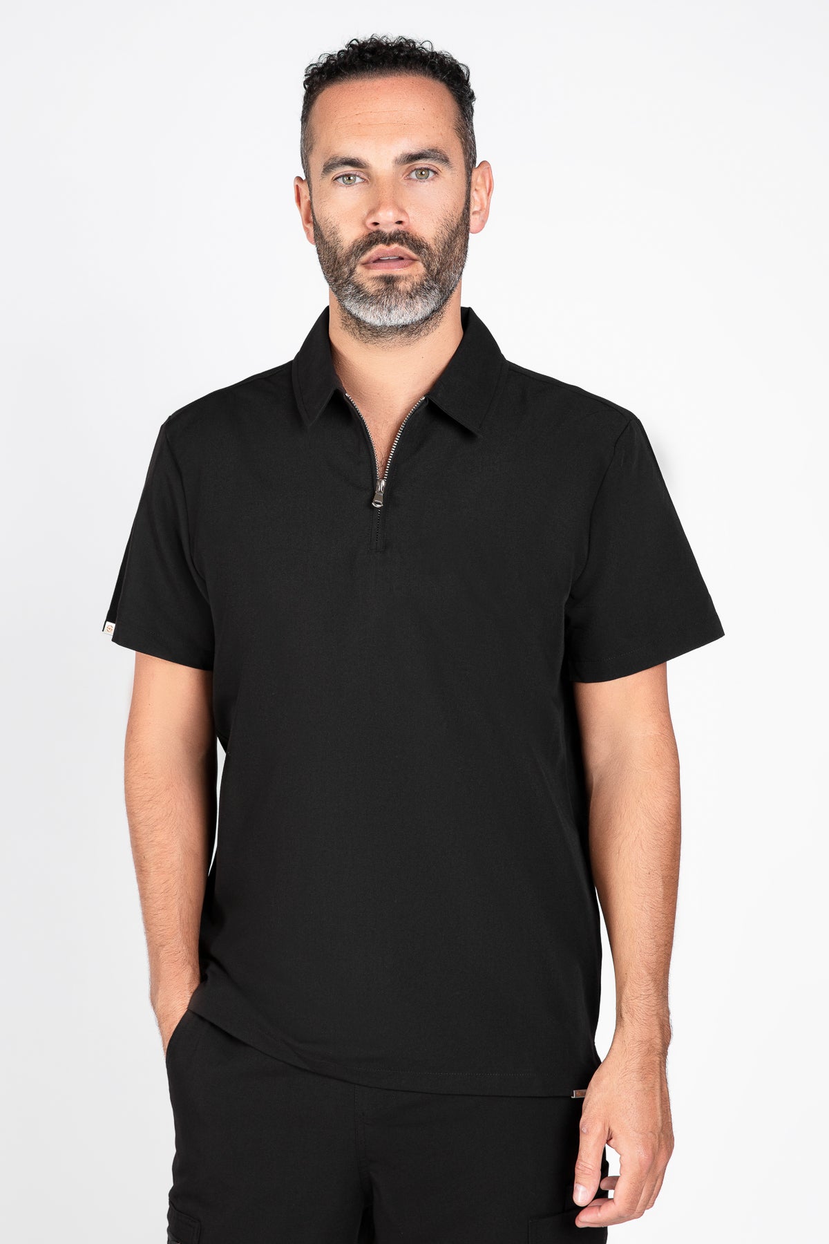 The black Zip Neck Polo Scrub is stylish and comfortable. It’s perfect for my long shifts as a dental surgeon.