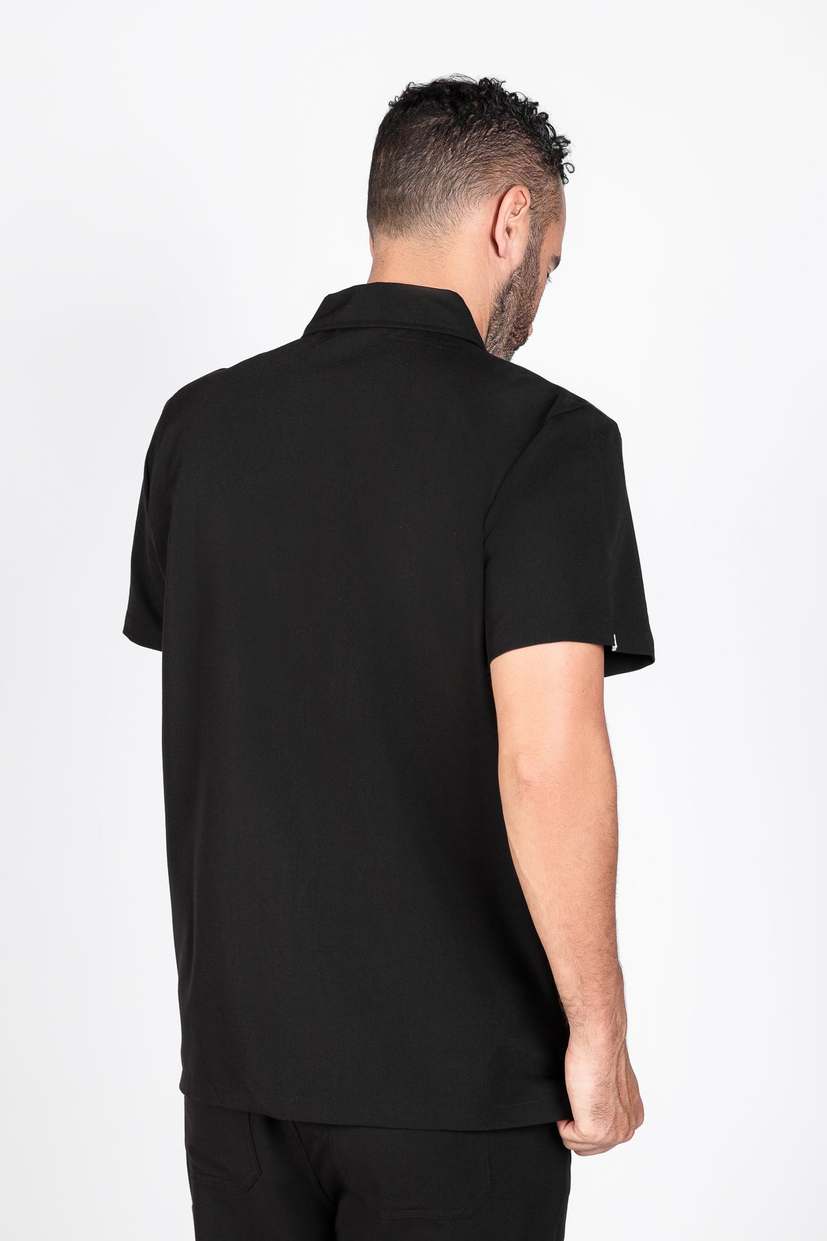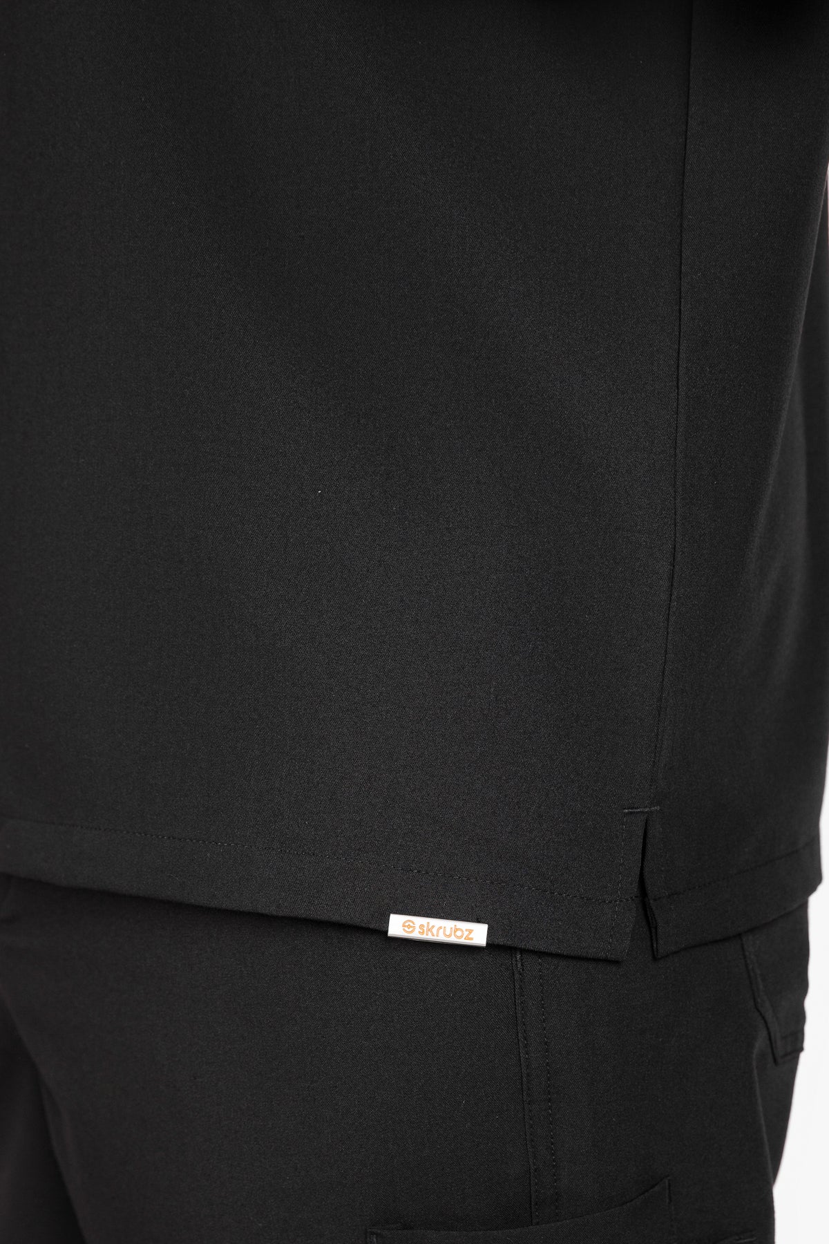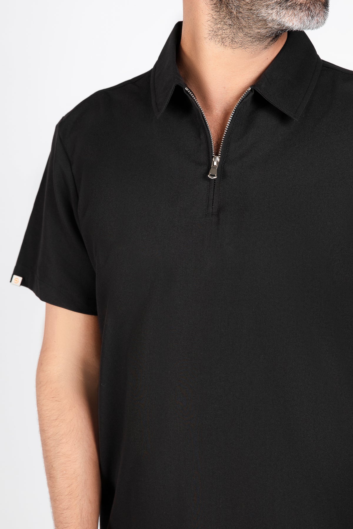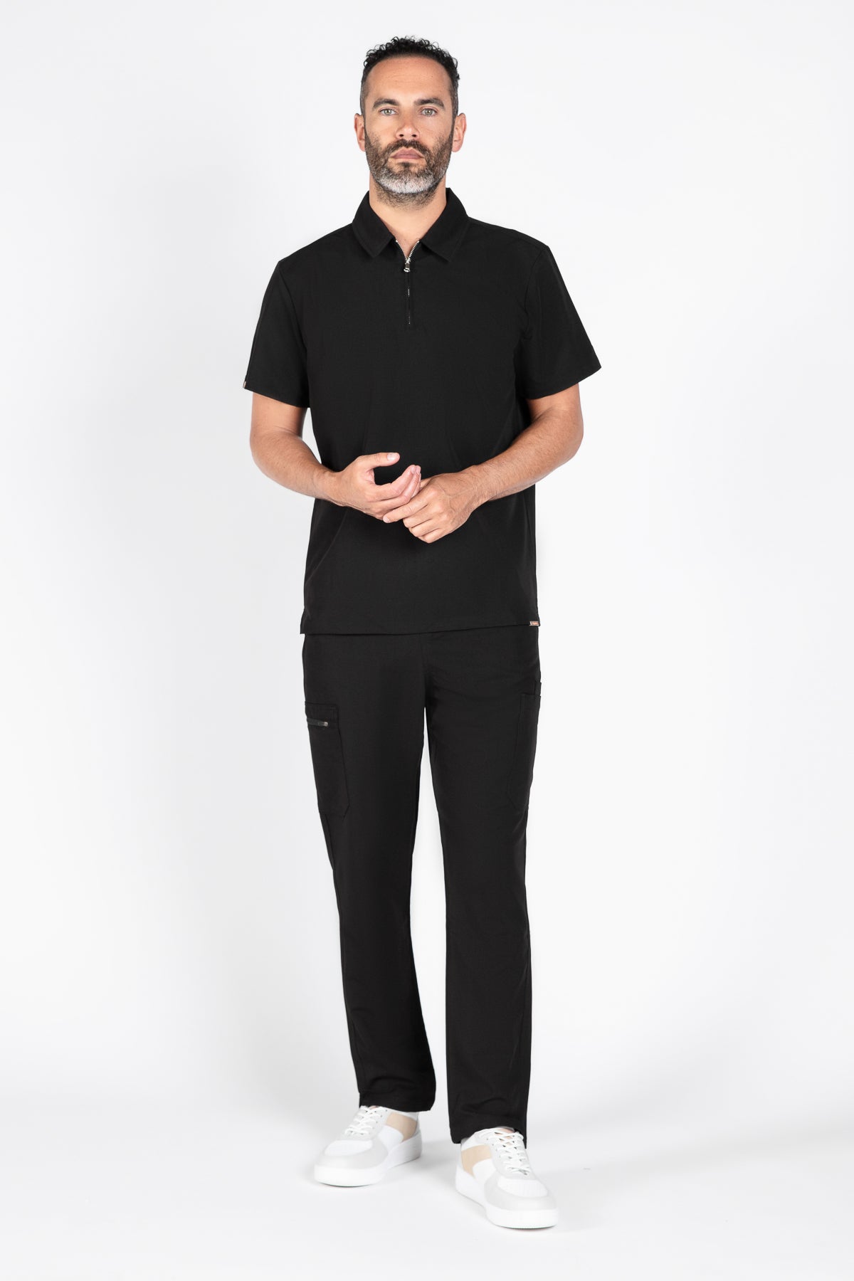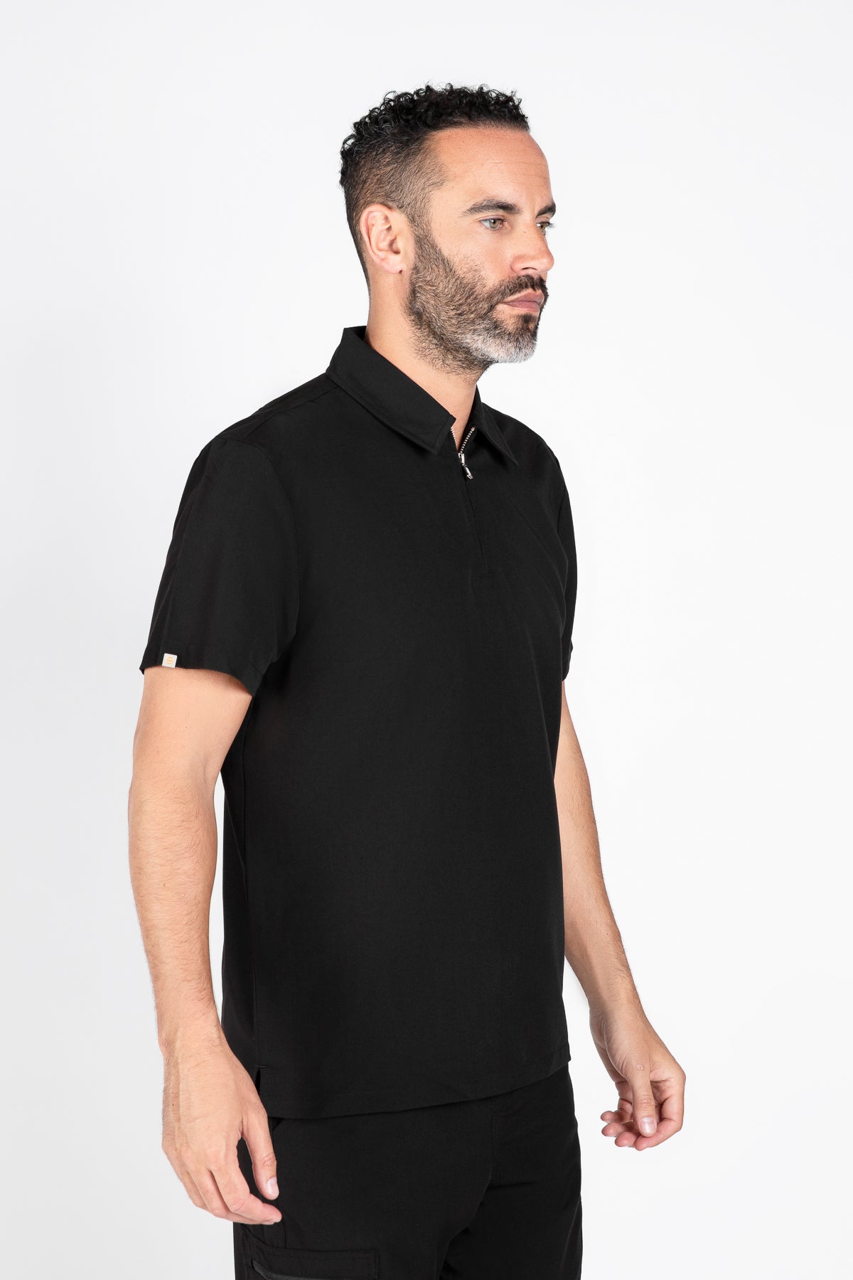 The black Zip Neck Polo Scrub is stylish and comfortable. It’s perfect for my long shifts as a dental surgeon.