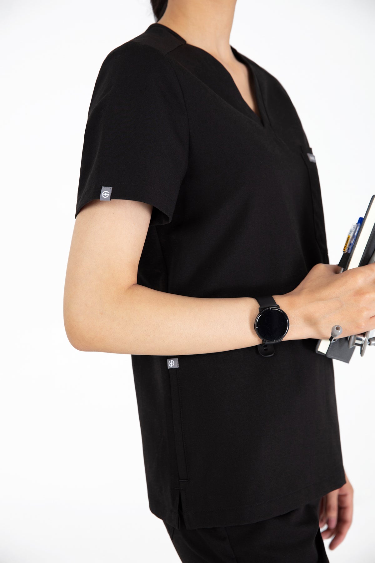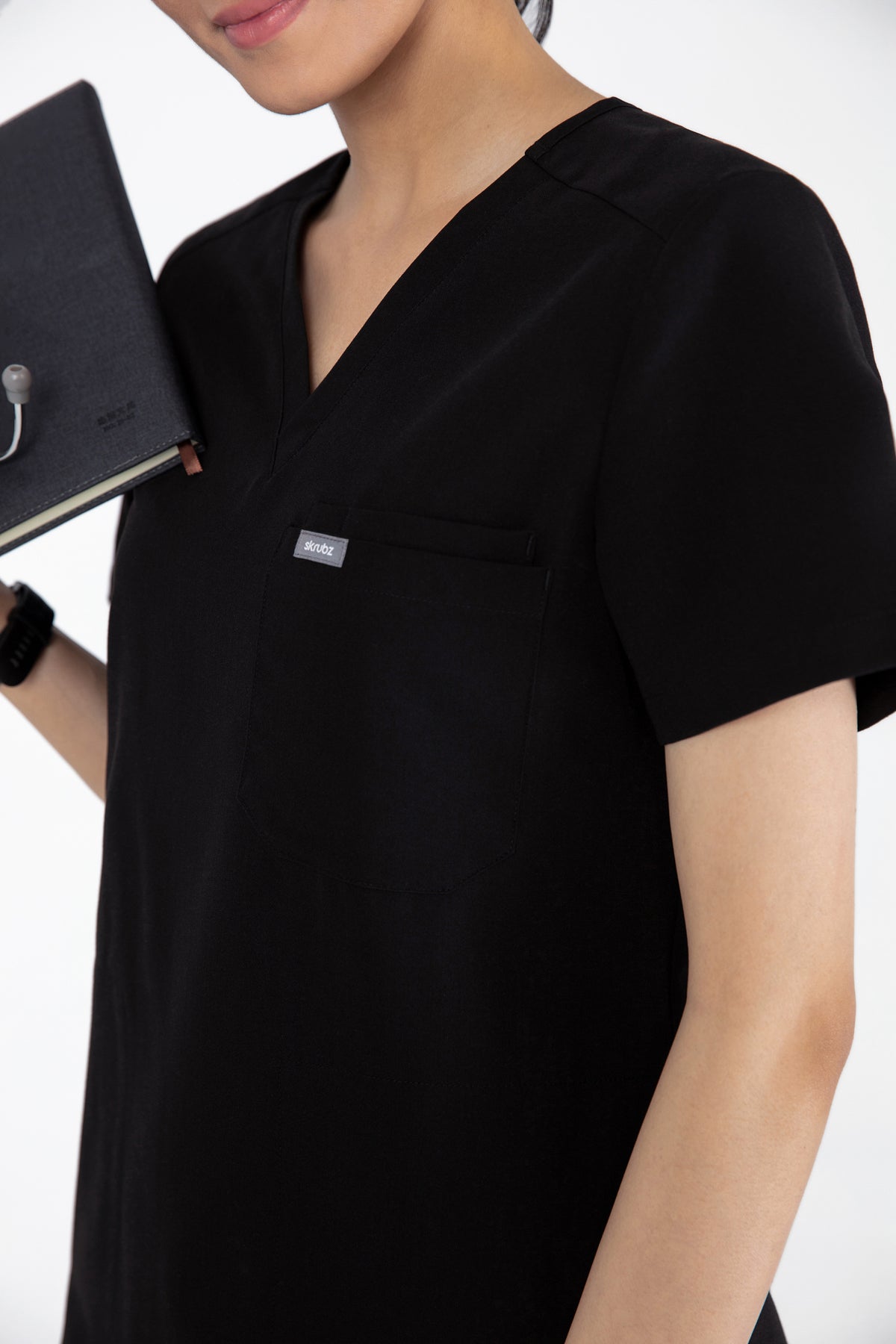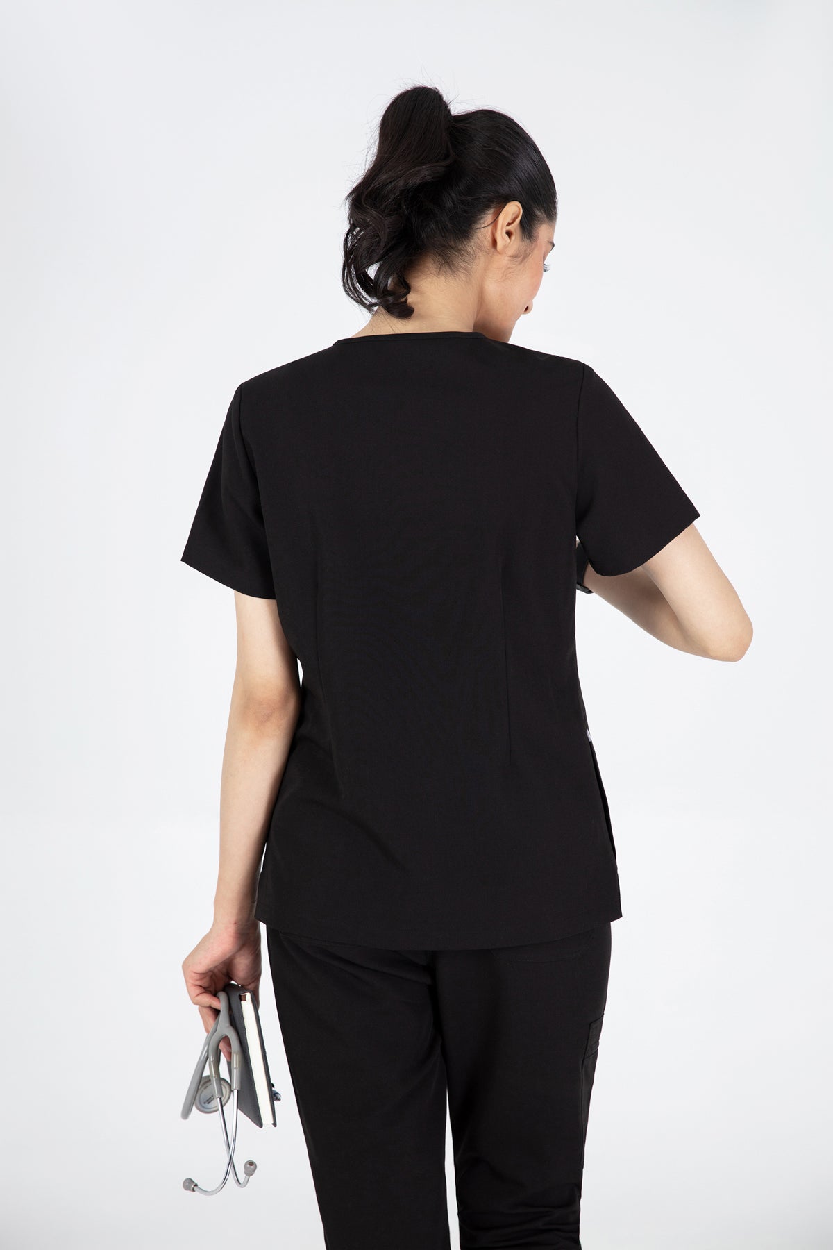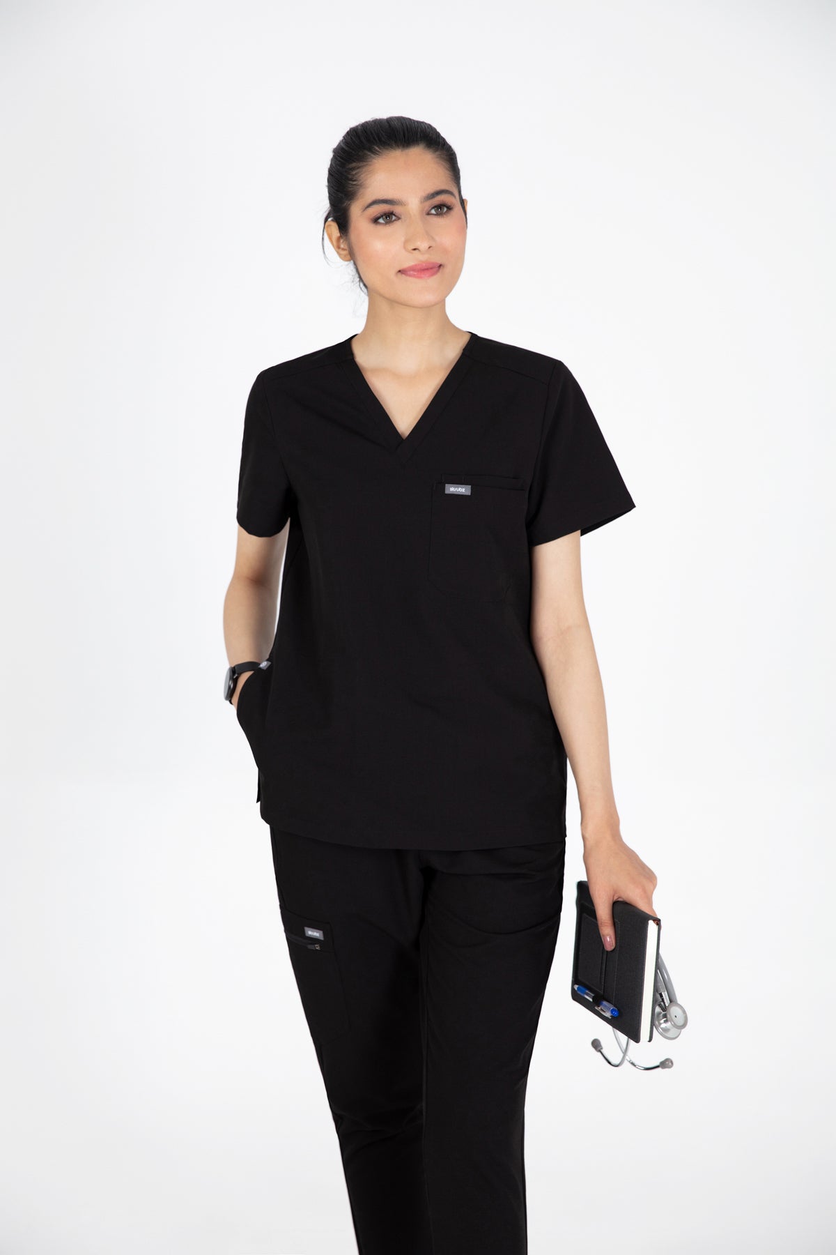 The black V Neck Scrub is so chic! The fit is excellent, and the invisible pockets are a wonderful bonus. It keeps me prepared and looking professional all day.