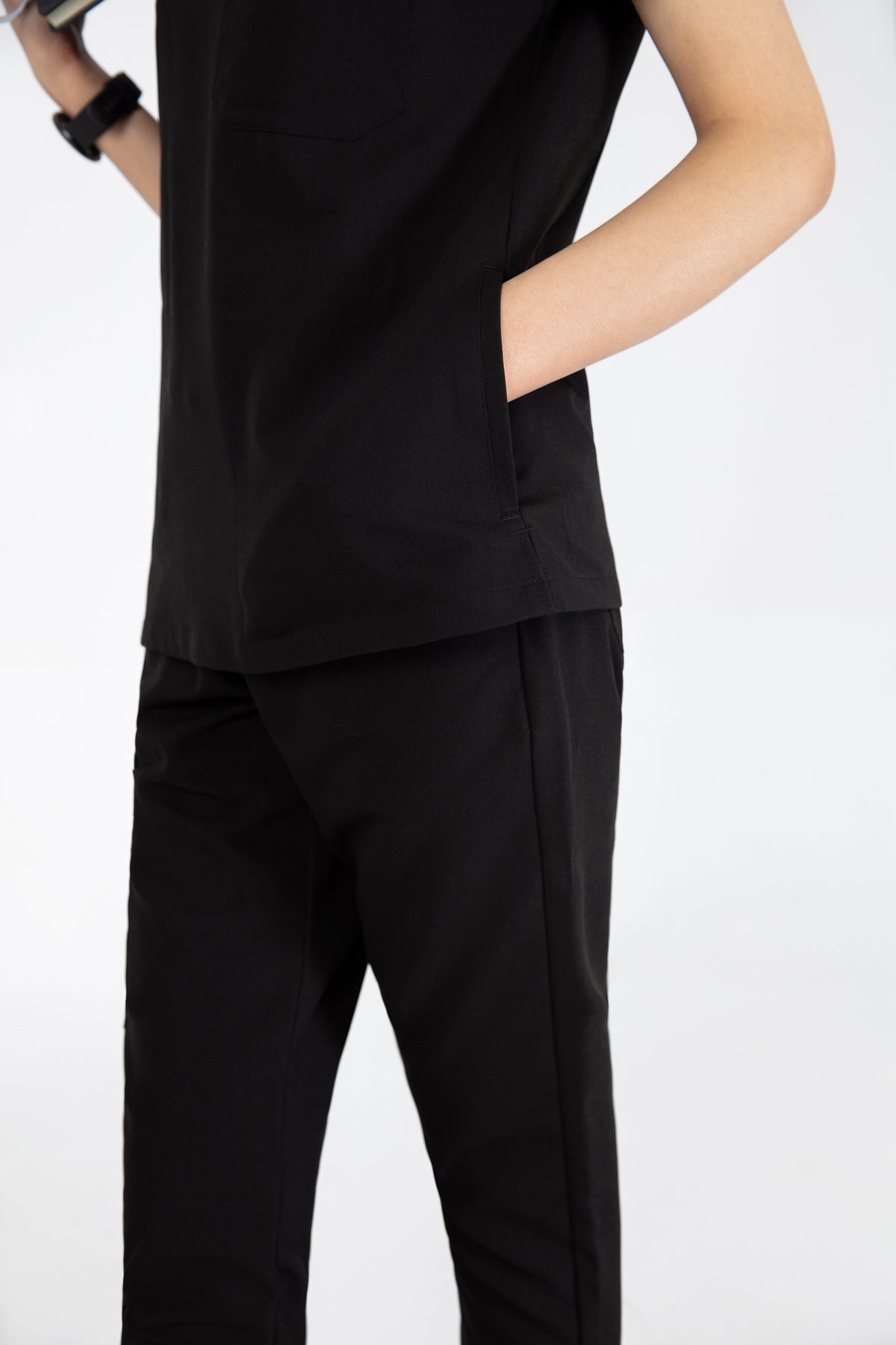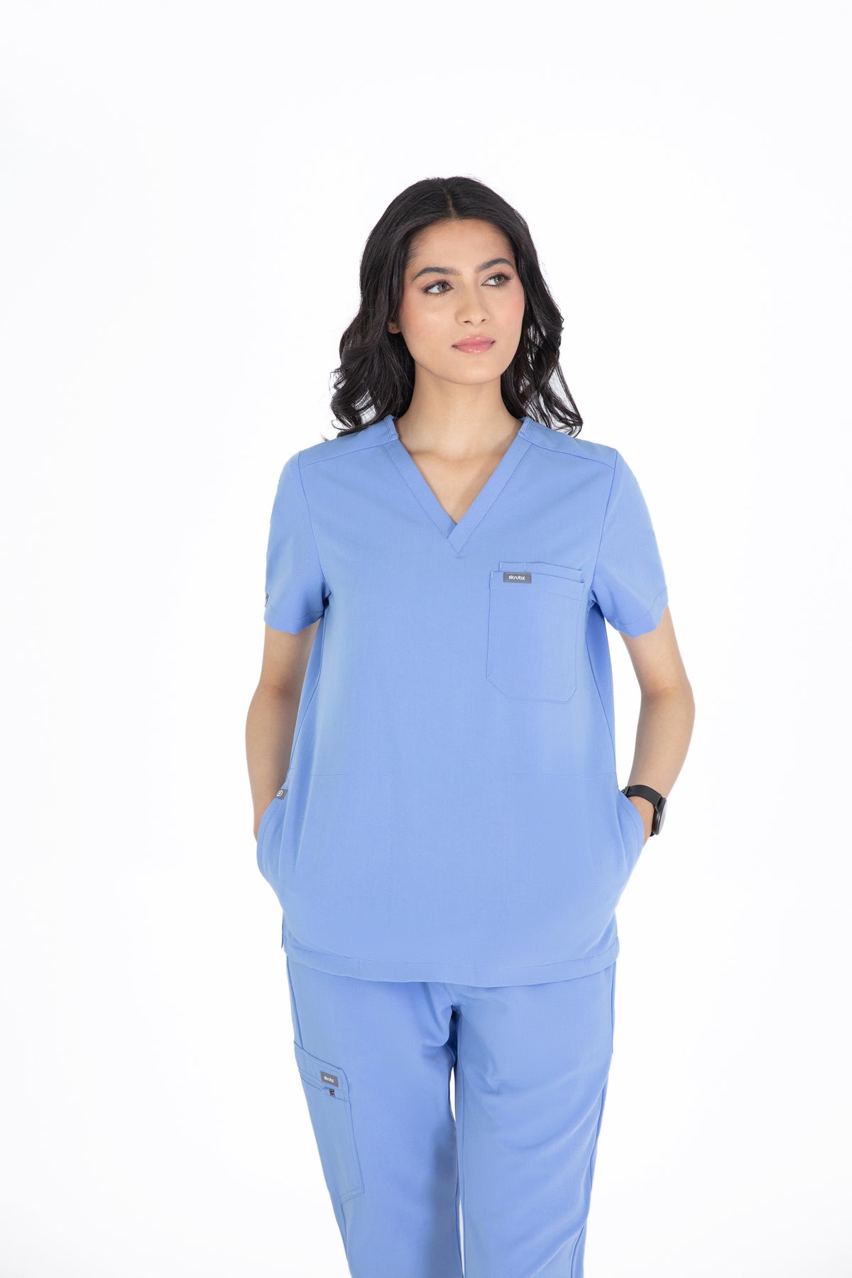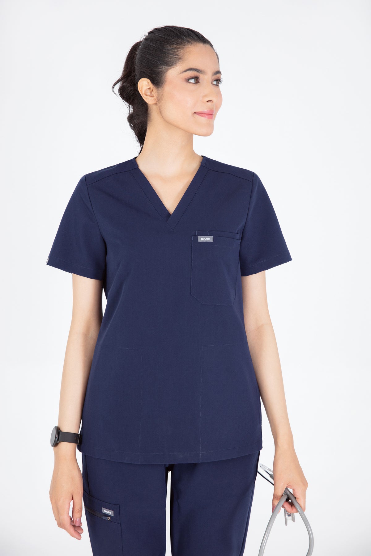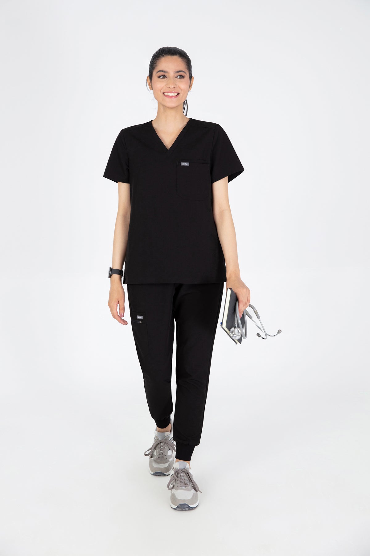 The black V Neck Scrub is so chic! The fit is excellent, and the invisible pockets are a wonderful bonus. It keeps me prepared and looking professional all day.