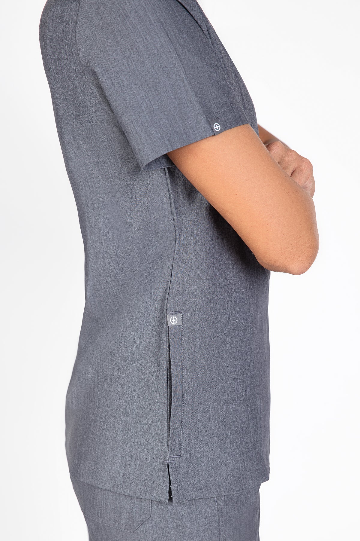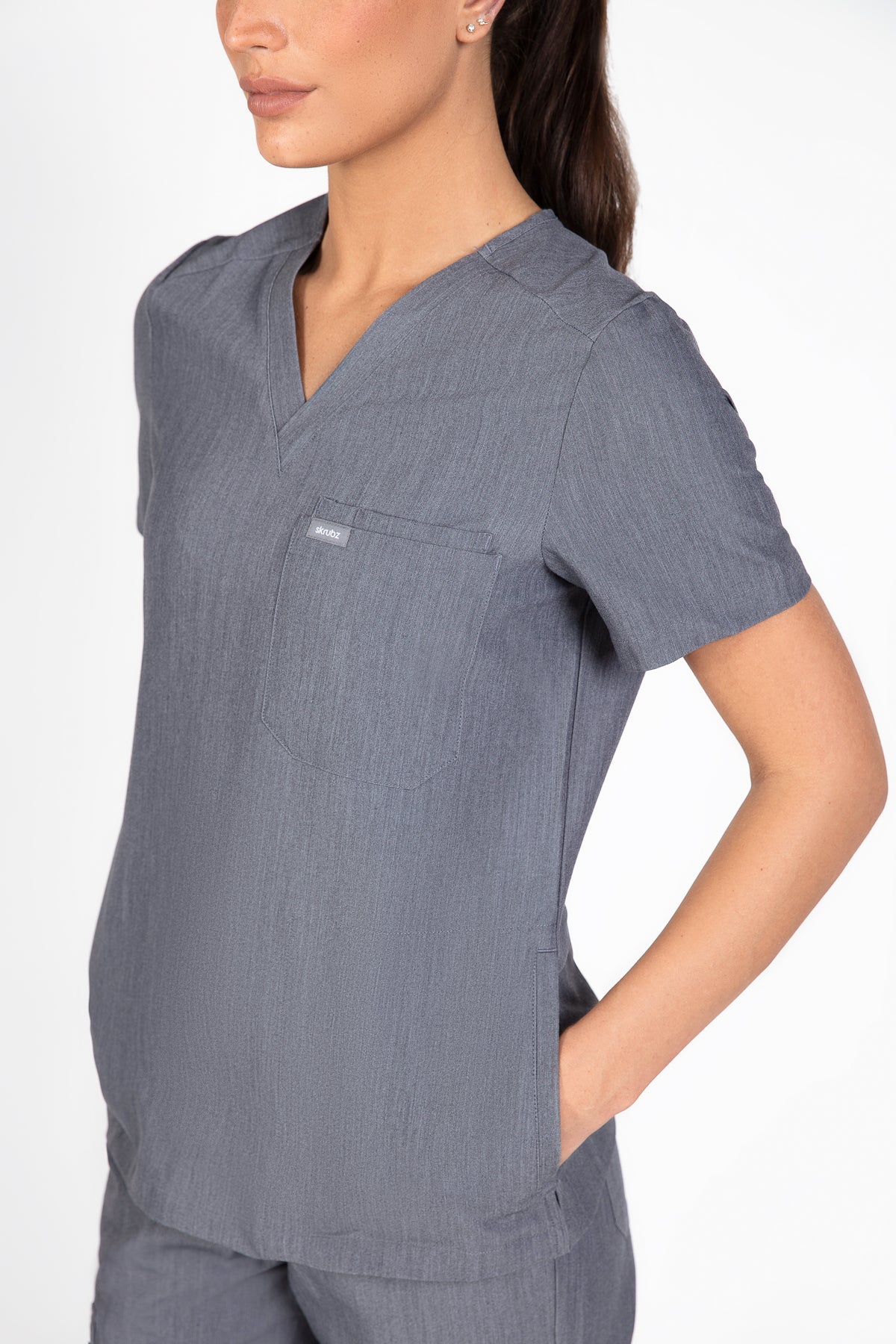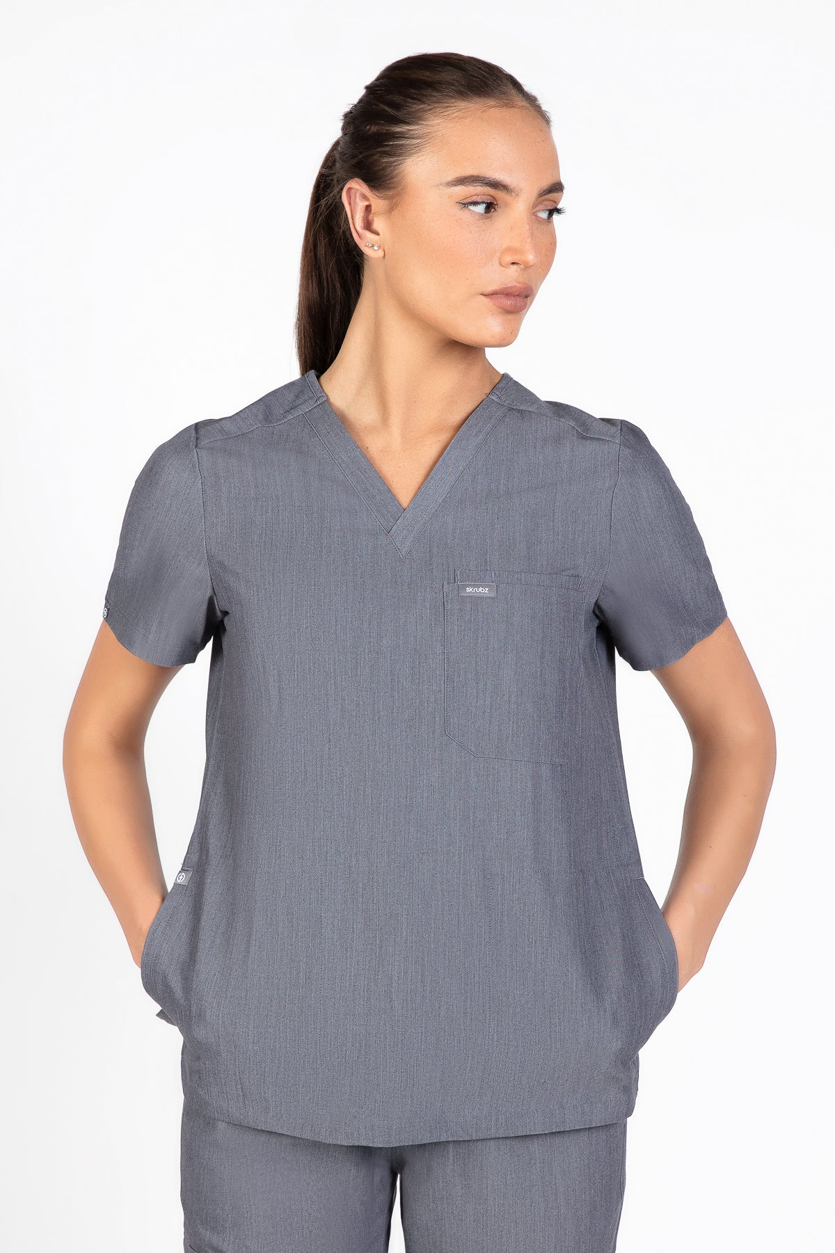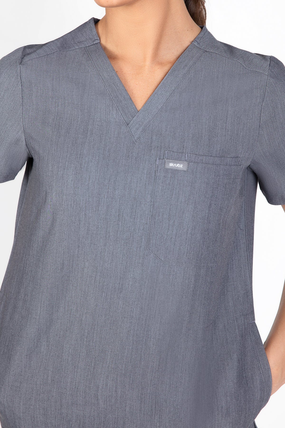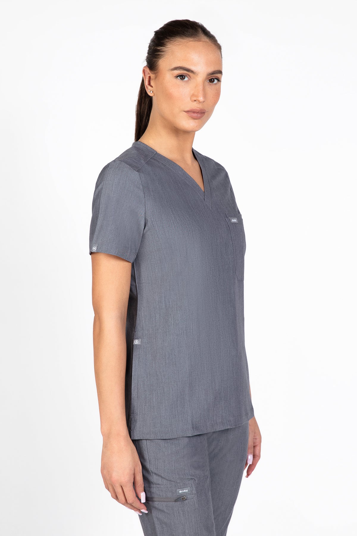 The SKRUBZ branded Kuro V Neck side pocket Scrub for Women is a professional's favourite lending a contemporary edge to a class silhouette. The short sleeve Kuro v-neck is a wardrobe staple chosen for its versatility as its cut to a slimline fit. This style is a contemporary take on a class design, featuring side splits and a double chest pocket perfect for a pen slot. We feel pockets make life better for you and your patients that’s why one of the key features to this top is the invisible side pockets cleverly constructed to discretely provide extra space. Our inseam pockets are hidden in the side seams, they are not obvious unless you put your hands inside them making them a sleek and flattering option. The Kuro top features 4-way stretch, breathability, anti-microbial and anti-wrinkle fabric.