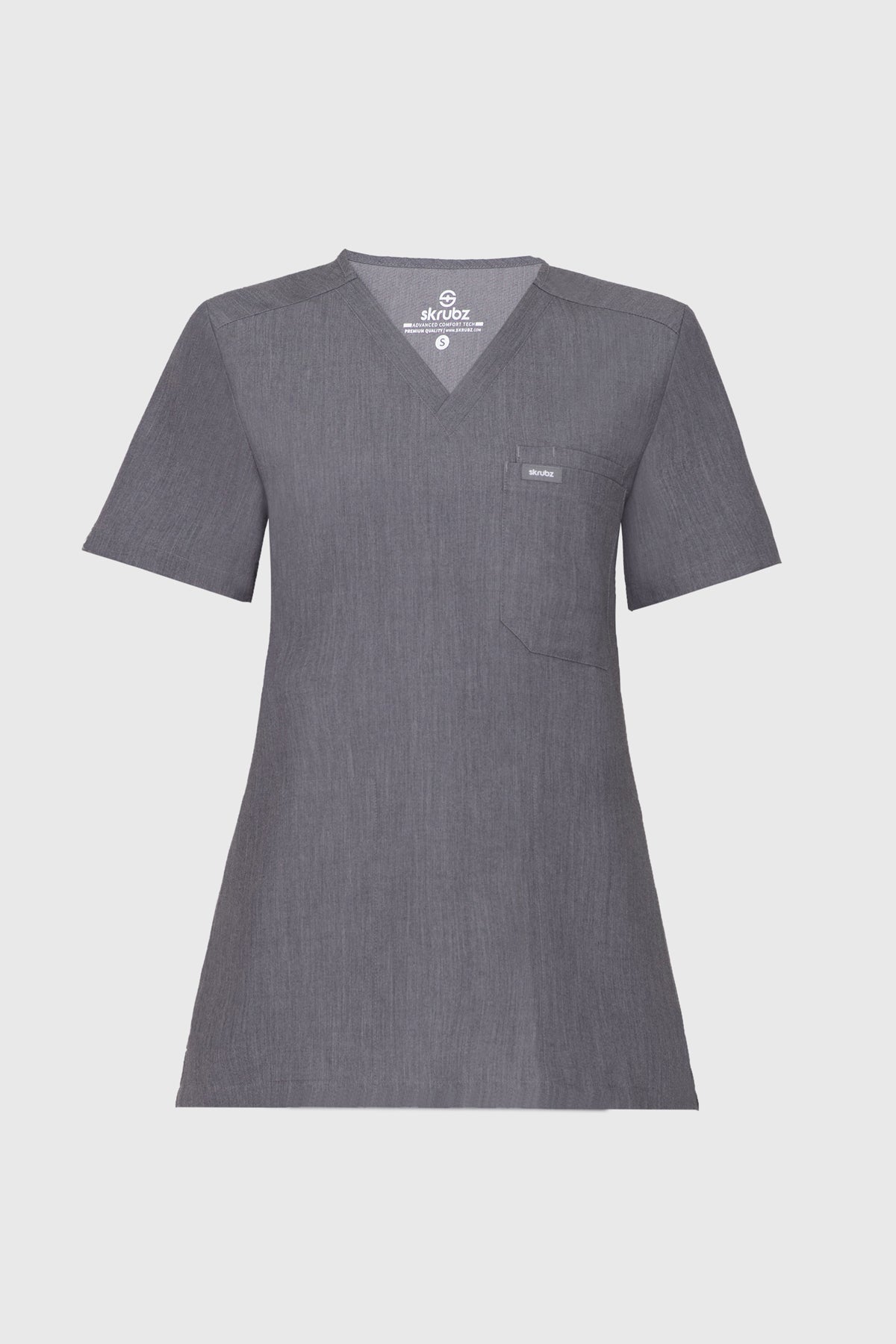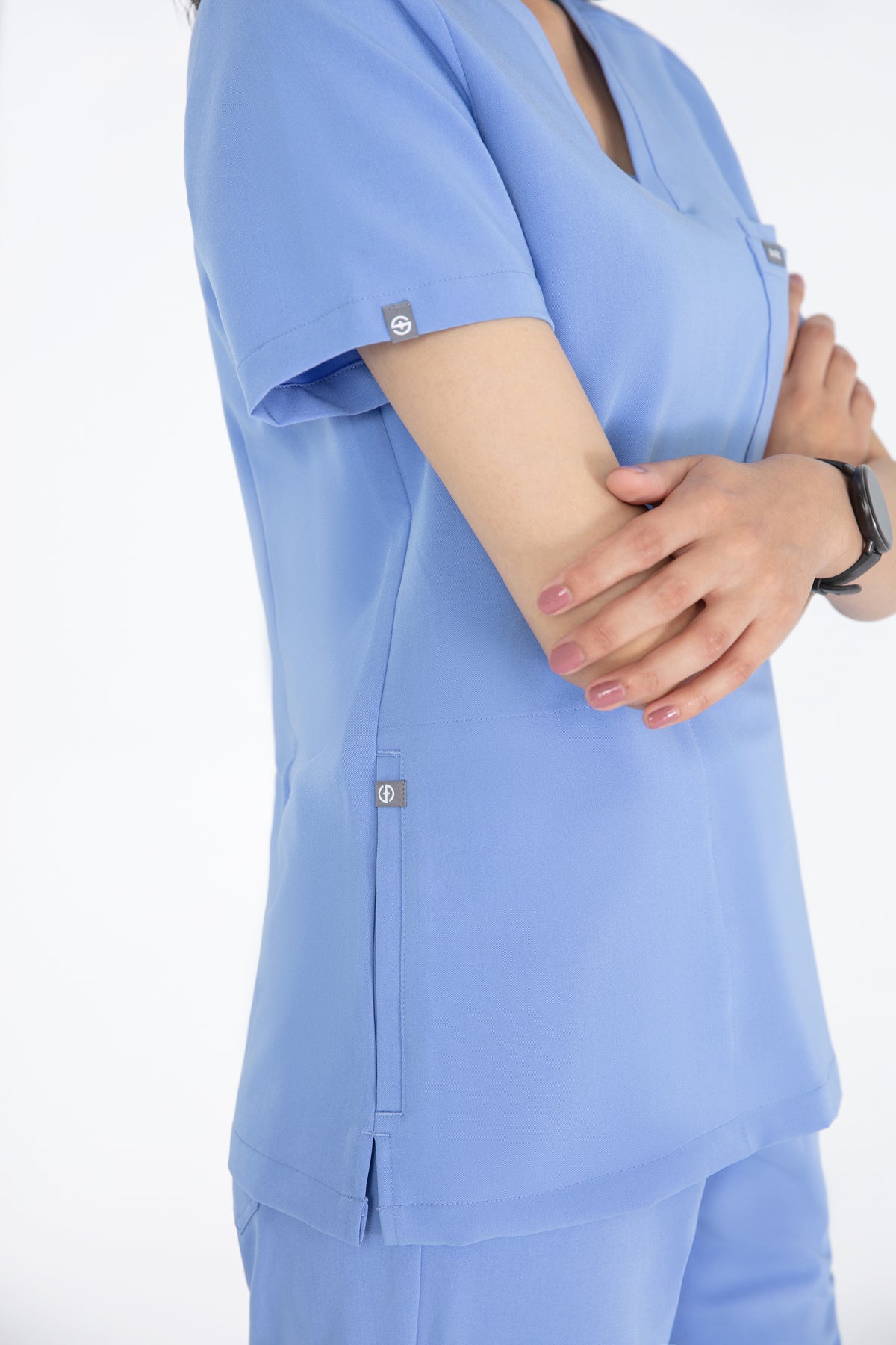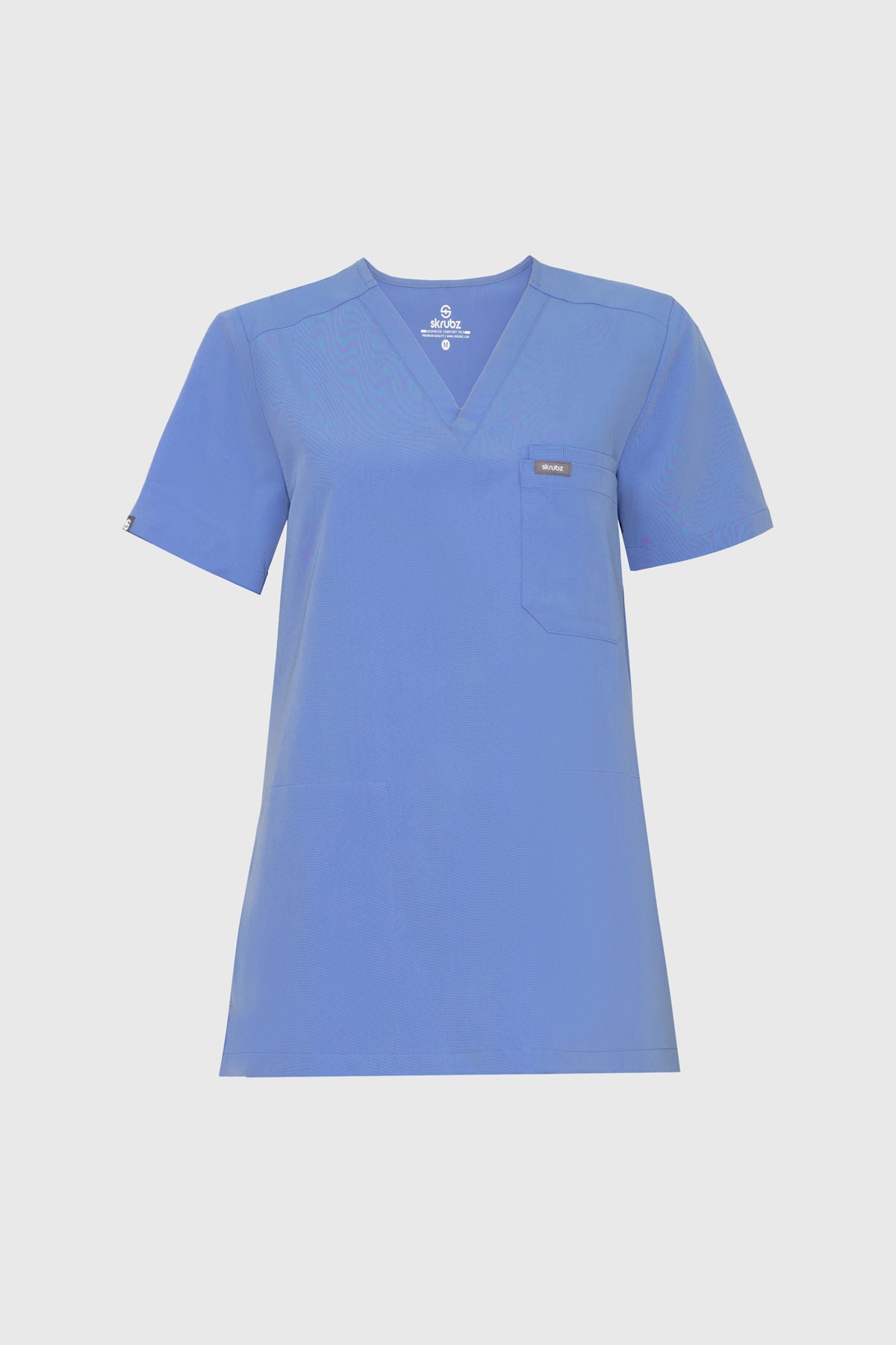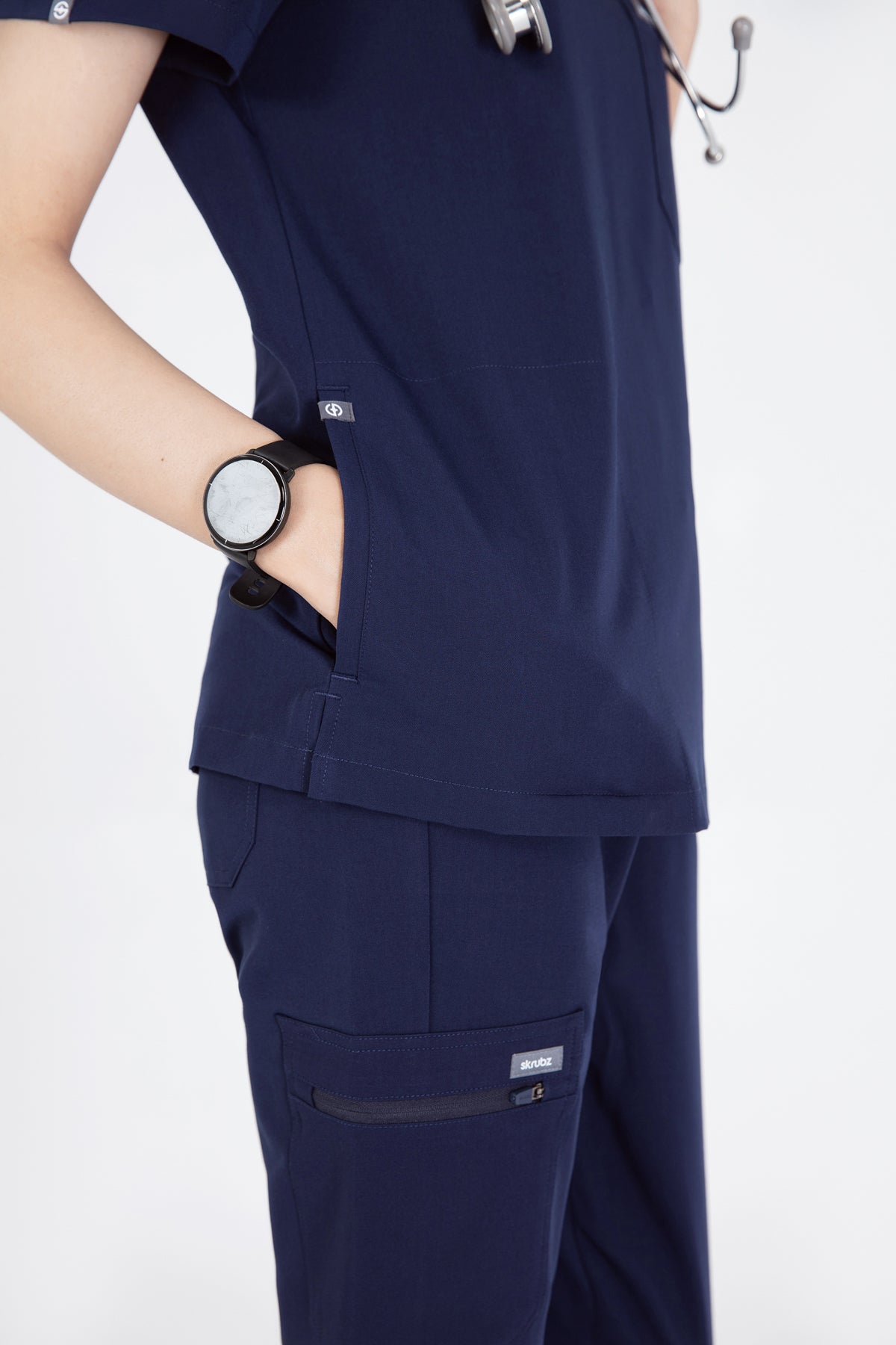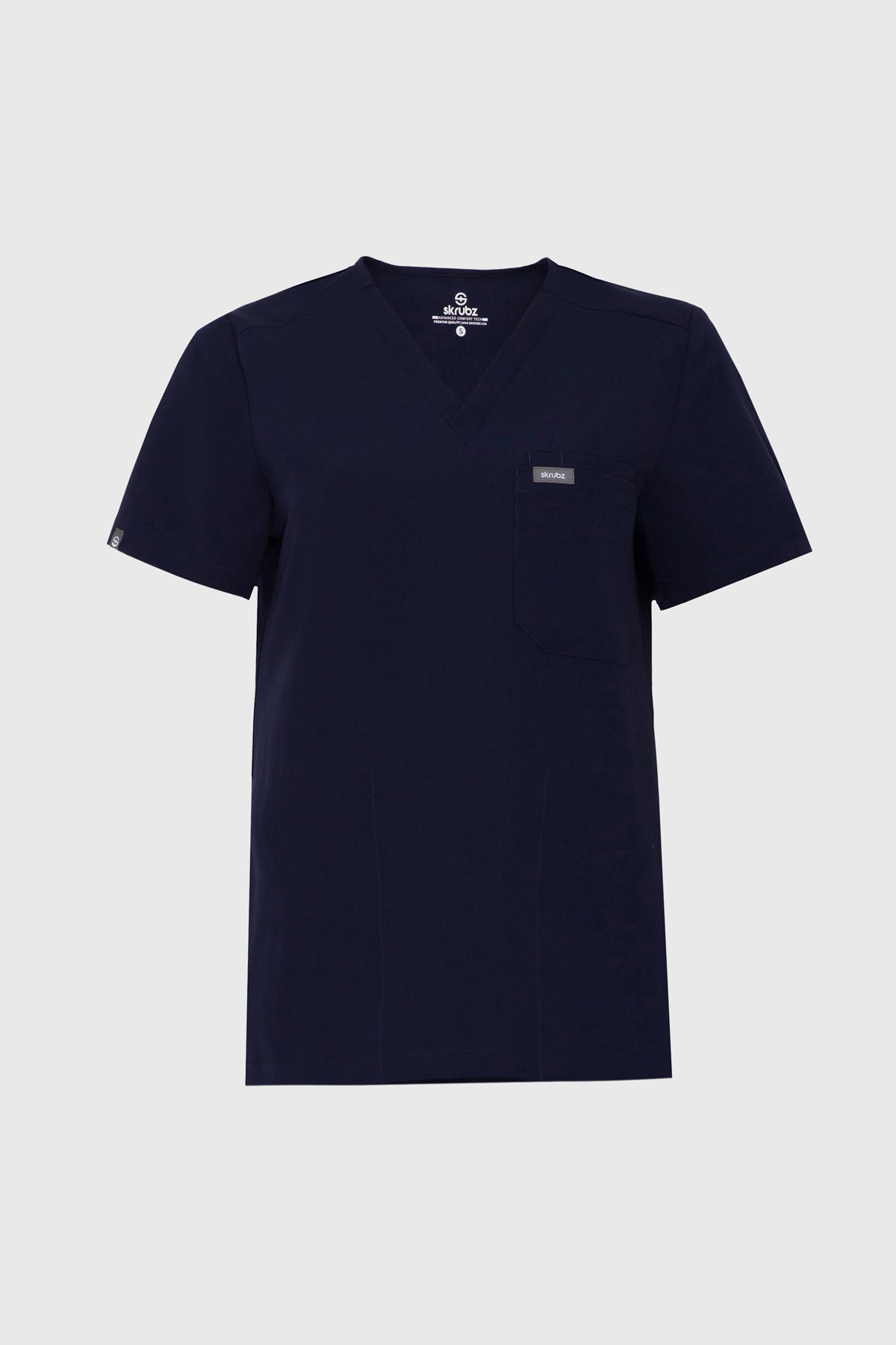 The SKRUBZ branded Kuro V Neck side pocket Scrub for Women is a professional's favourite lending a contemporary edge to a class silhouette. The short sleeve Kuro v-neck is a wardrobe staple chosen for its versatility as its cut to a slimline fit. This style is a contemporary take on a class design, featuring side splits and a double chest pocket perfect for a pen slot. We feel pockets make life better for you and your patients that’s why one of the key features to this top is the invisible side pockets cleverly constructed to discretely provide extra space. Our inseam pockets are hidden in the side seams, they are not obvious unless you put your hands inside them making them a sleek and flattering option. The Kuro top features 4-way stretch, breathability, anti-microbial and anti-wrinkle fabric.