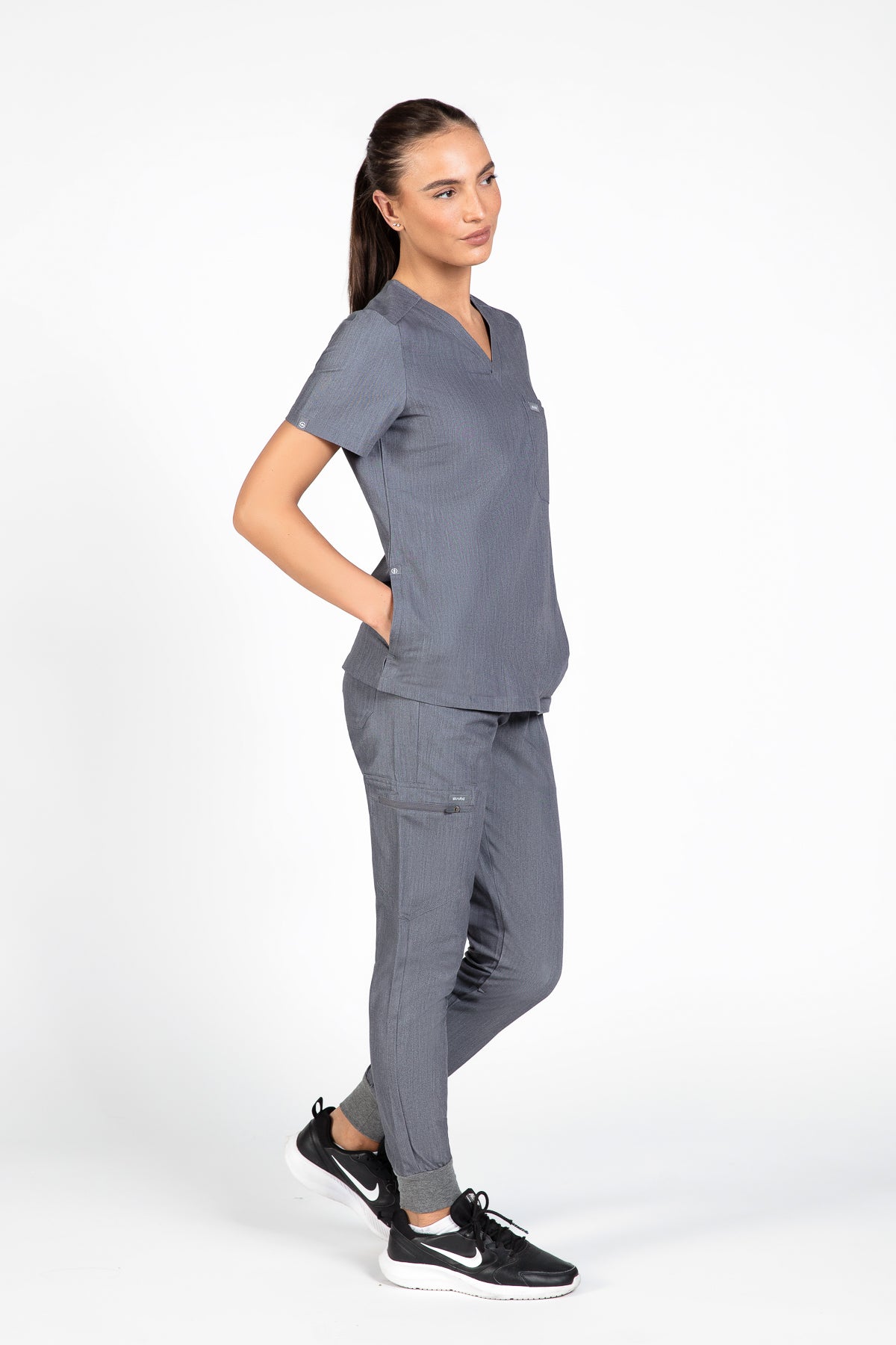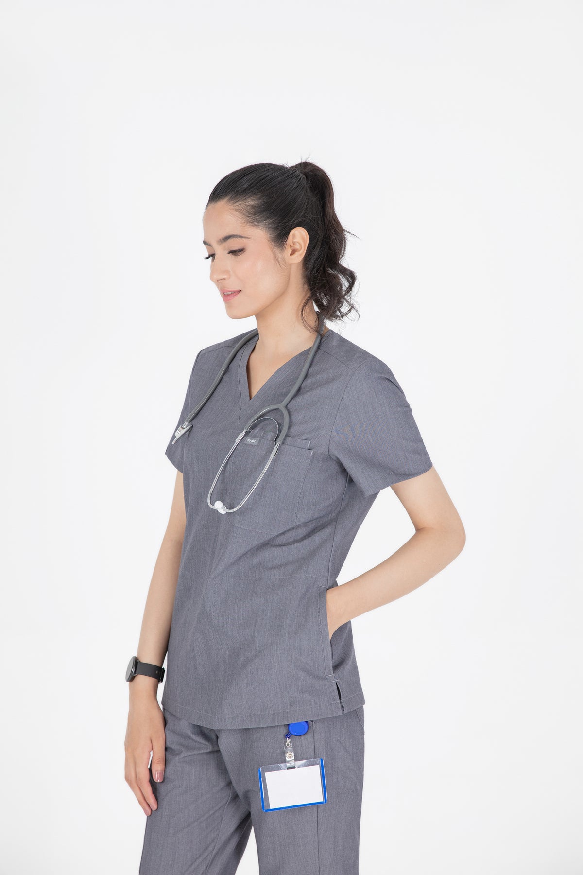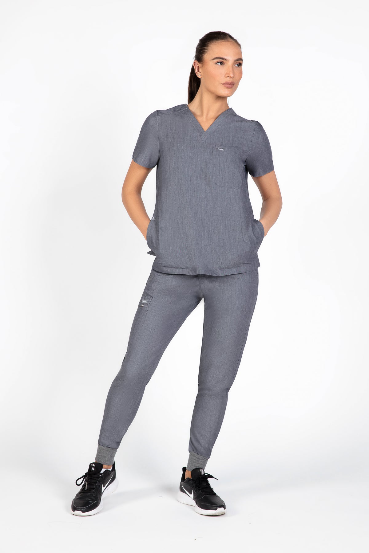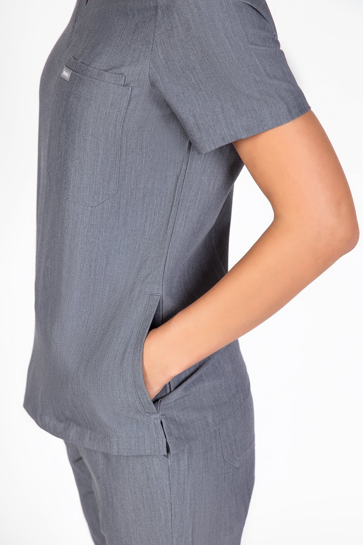 The quiet grey scrub looks is fantastic for a professional look. It’s soft, comfortable, and the color is just right for the workplace. The pocket is a nice touch for practicality.