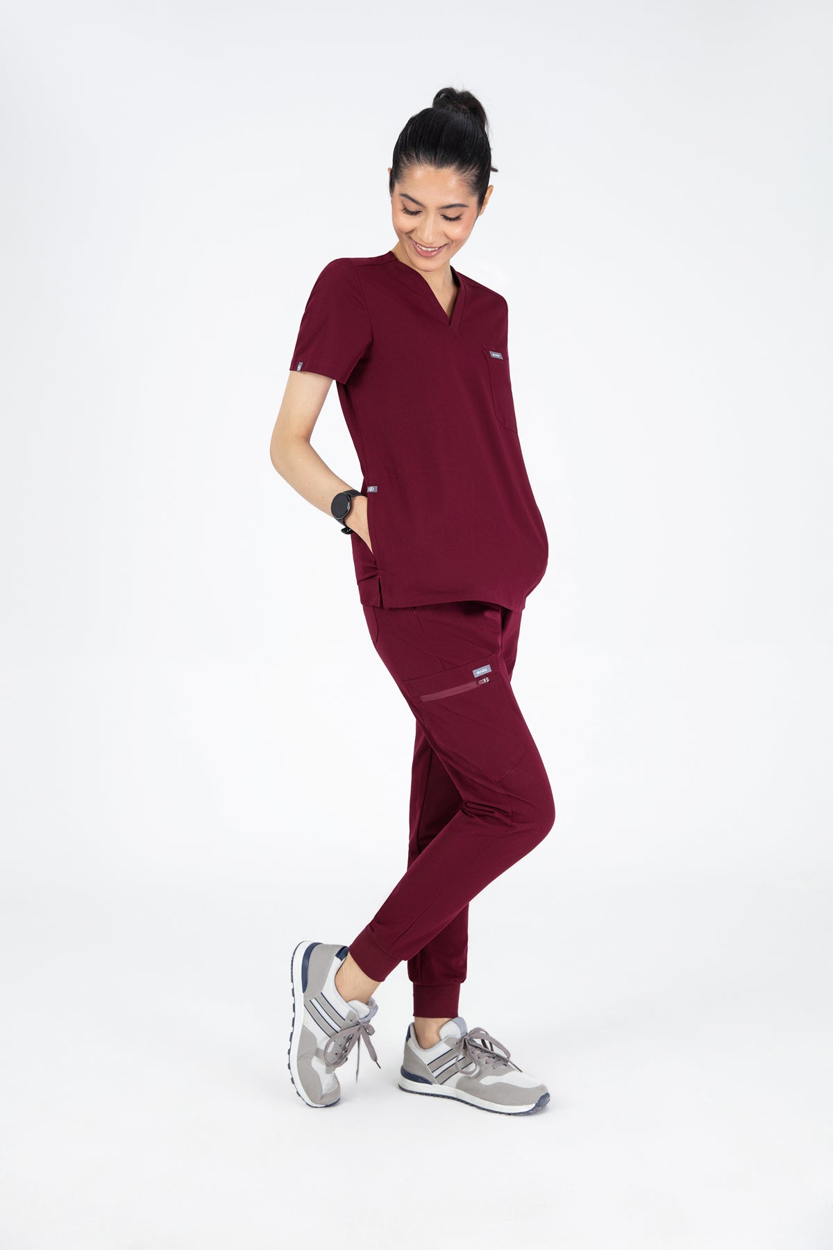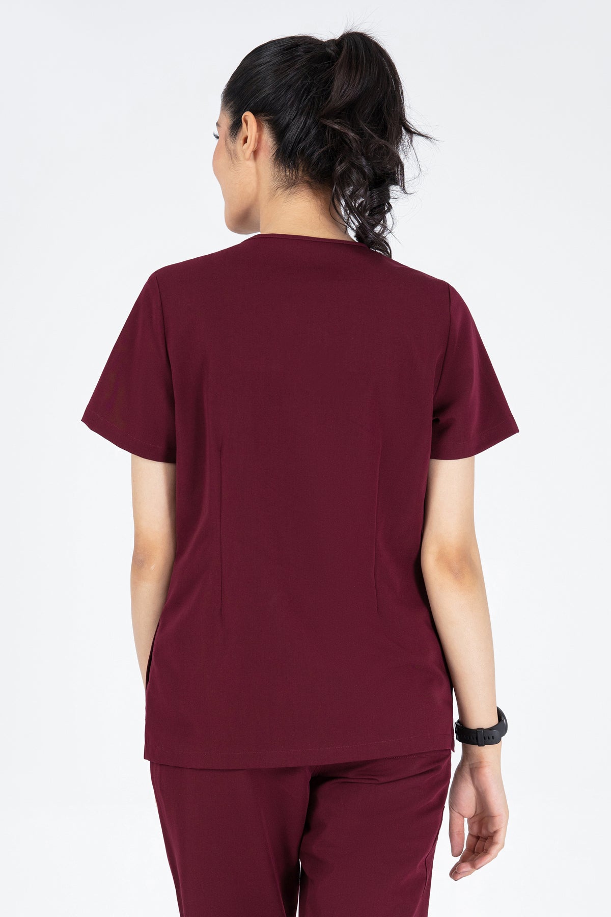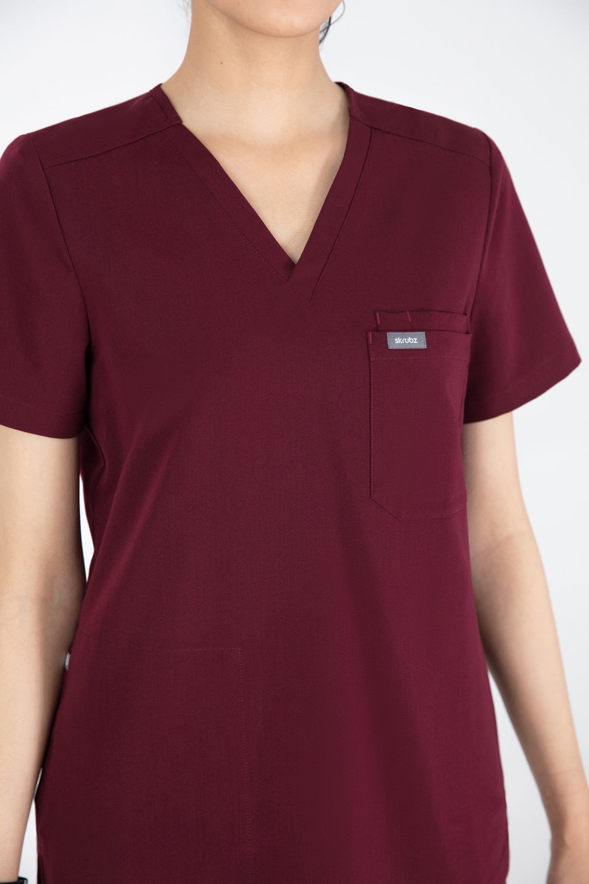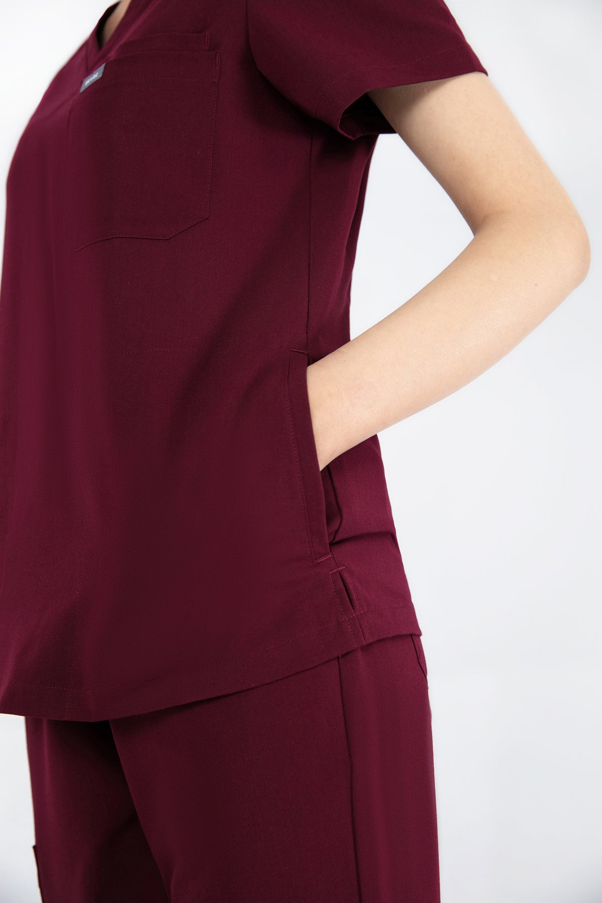 The burgundy V Neck Scrub is rich in colour and comfort. It’s well-made and the pocket is perfect for keeping my essentials close by.