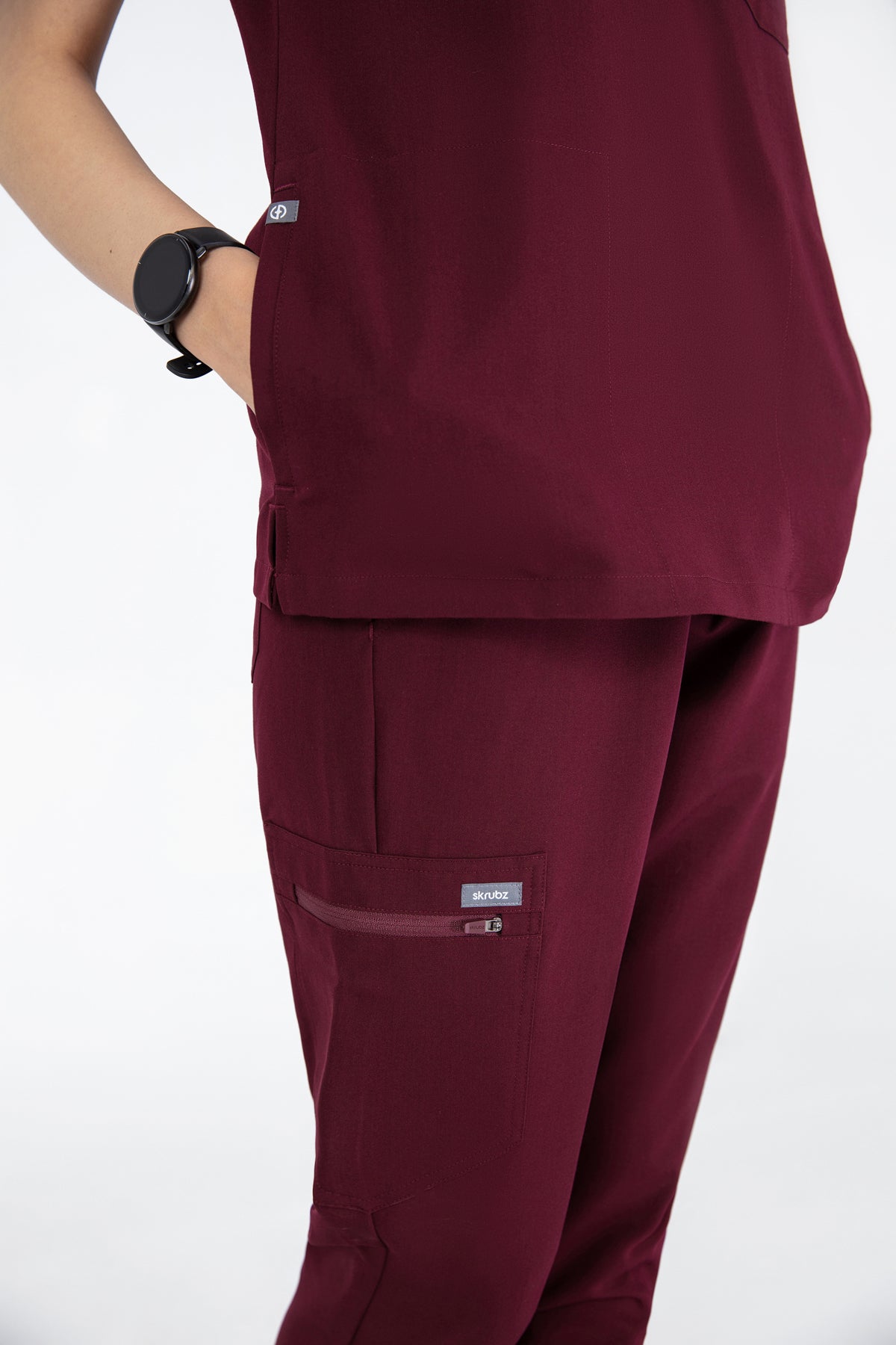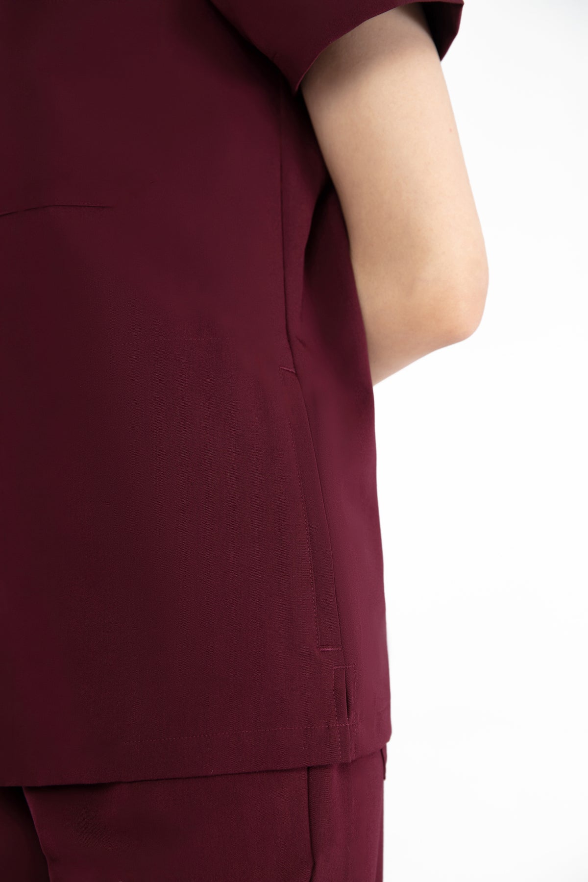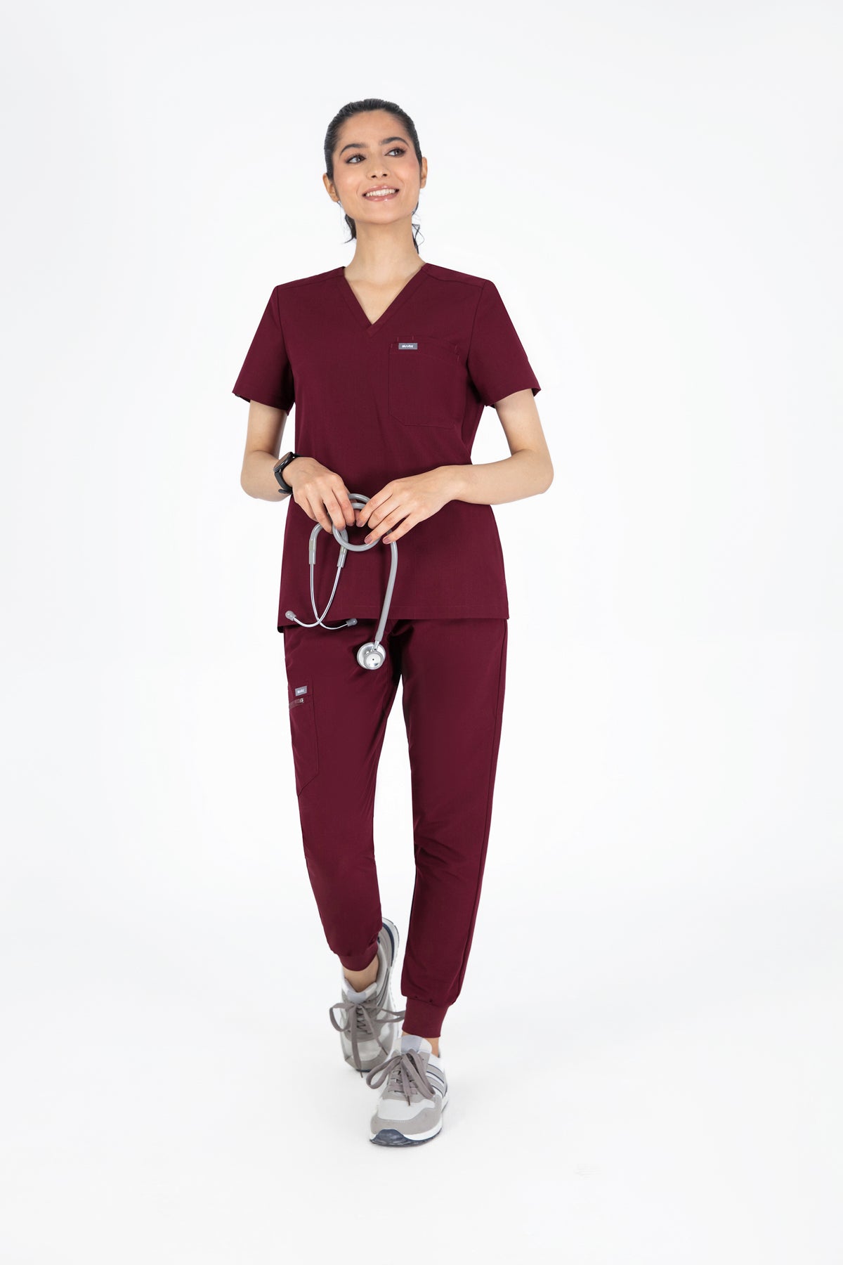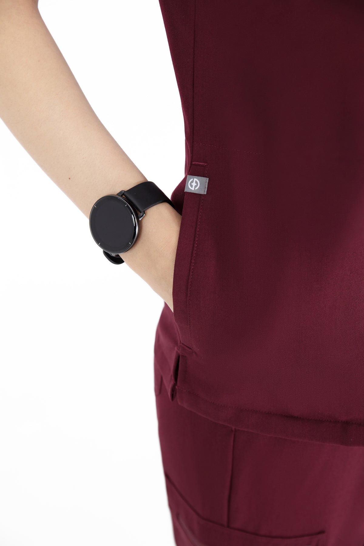 The burgundy V Neck Scrub is rich in colour and comfort. It’s well-made and the pocket is perfect for keeping my essentials close by.